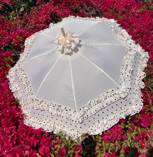 Double Frill Cream Umbrella with Polka Dots | Cream Ruffle Topper | Pagoda Shape
