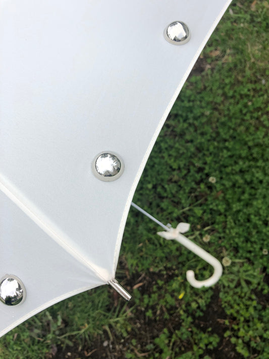 Sombrilla Amelia color crema | Dosel con forma de ojiva | Perlas plateadas | Hecho a medida