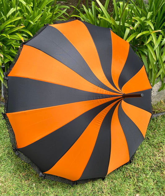 Paraguas Pagoda Naranja y Negro de 16 Paneles | Cintas y Ribete de Encaje | Mango Elegante