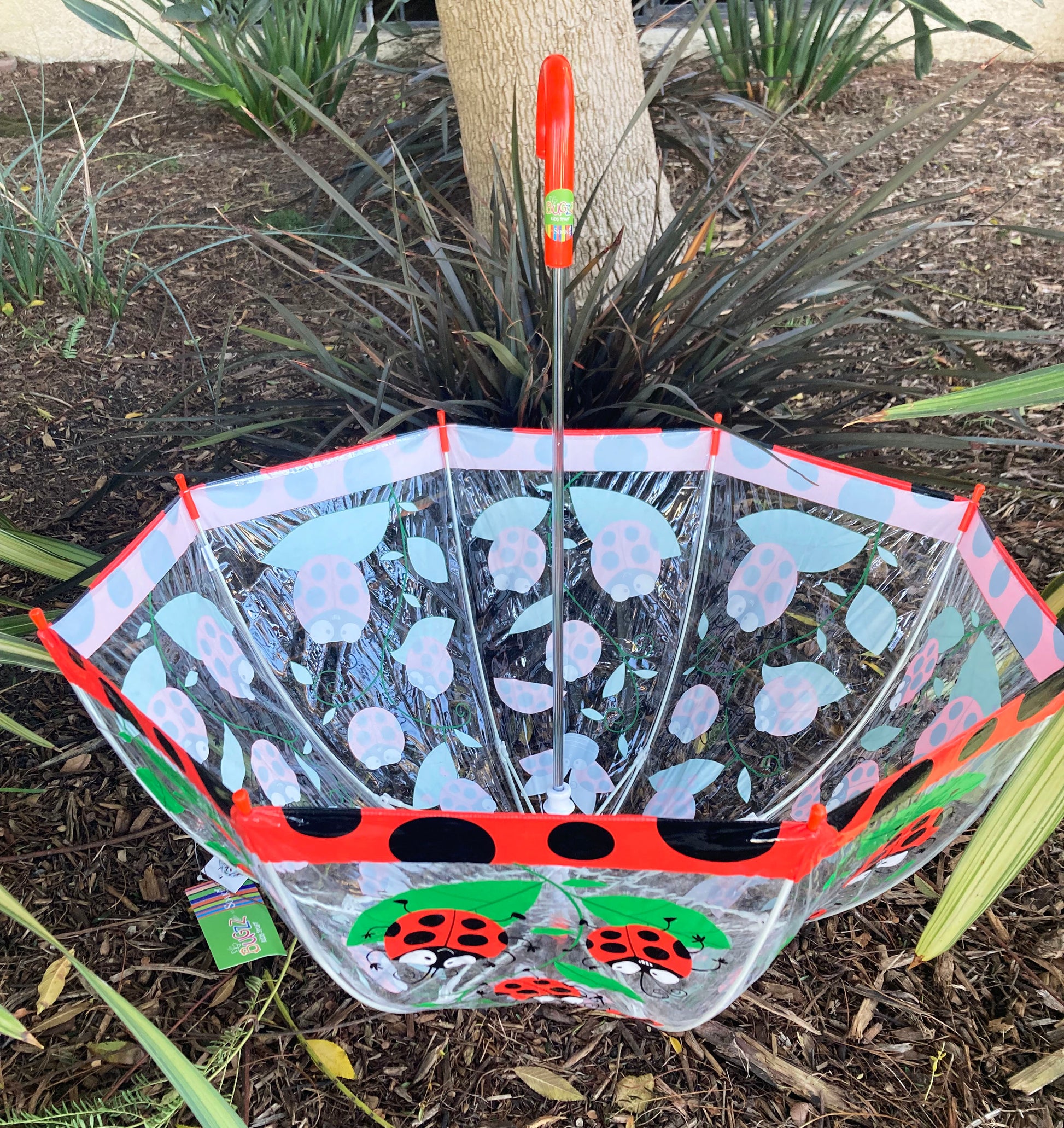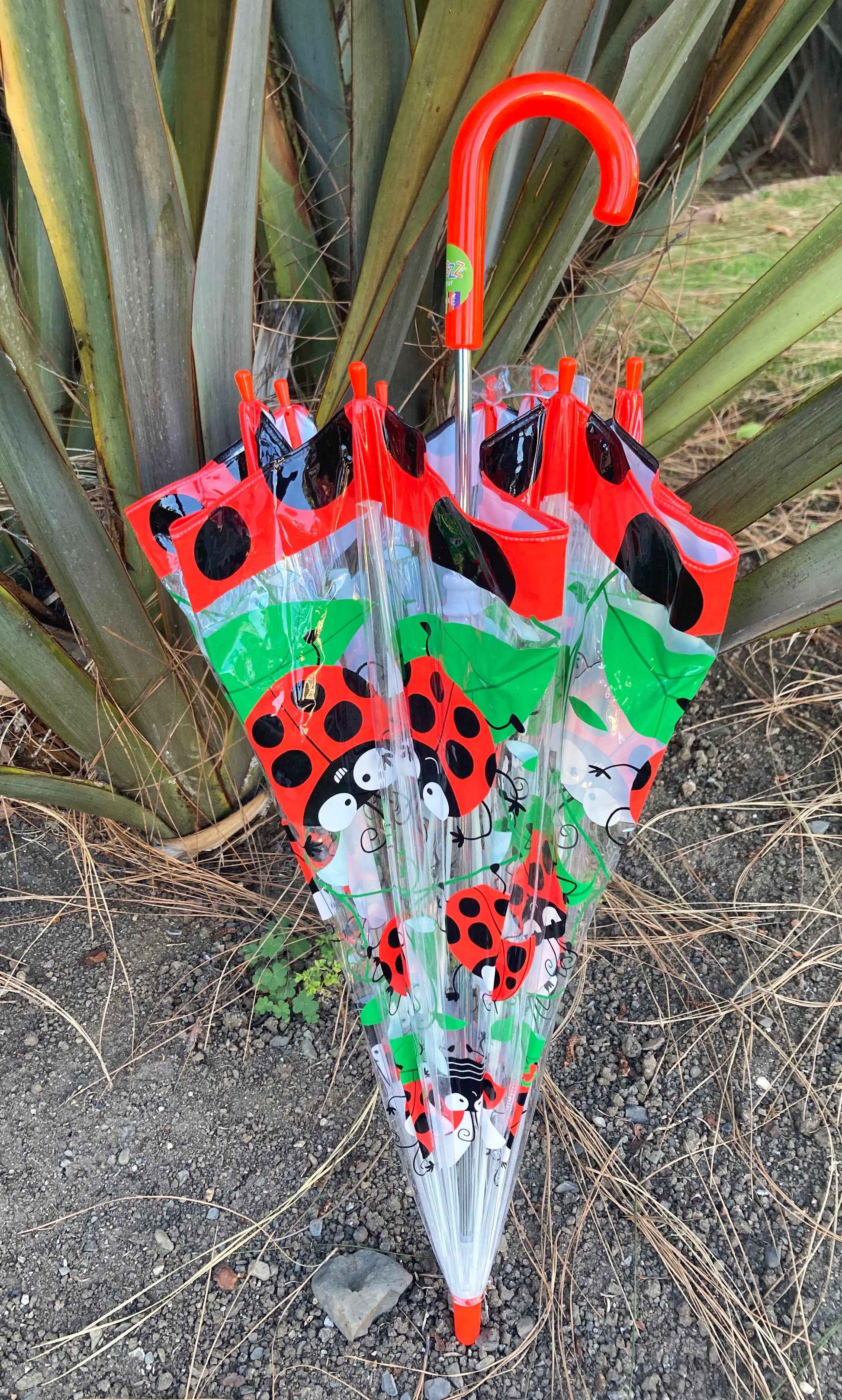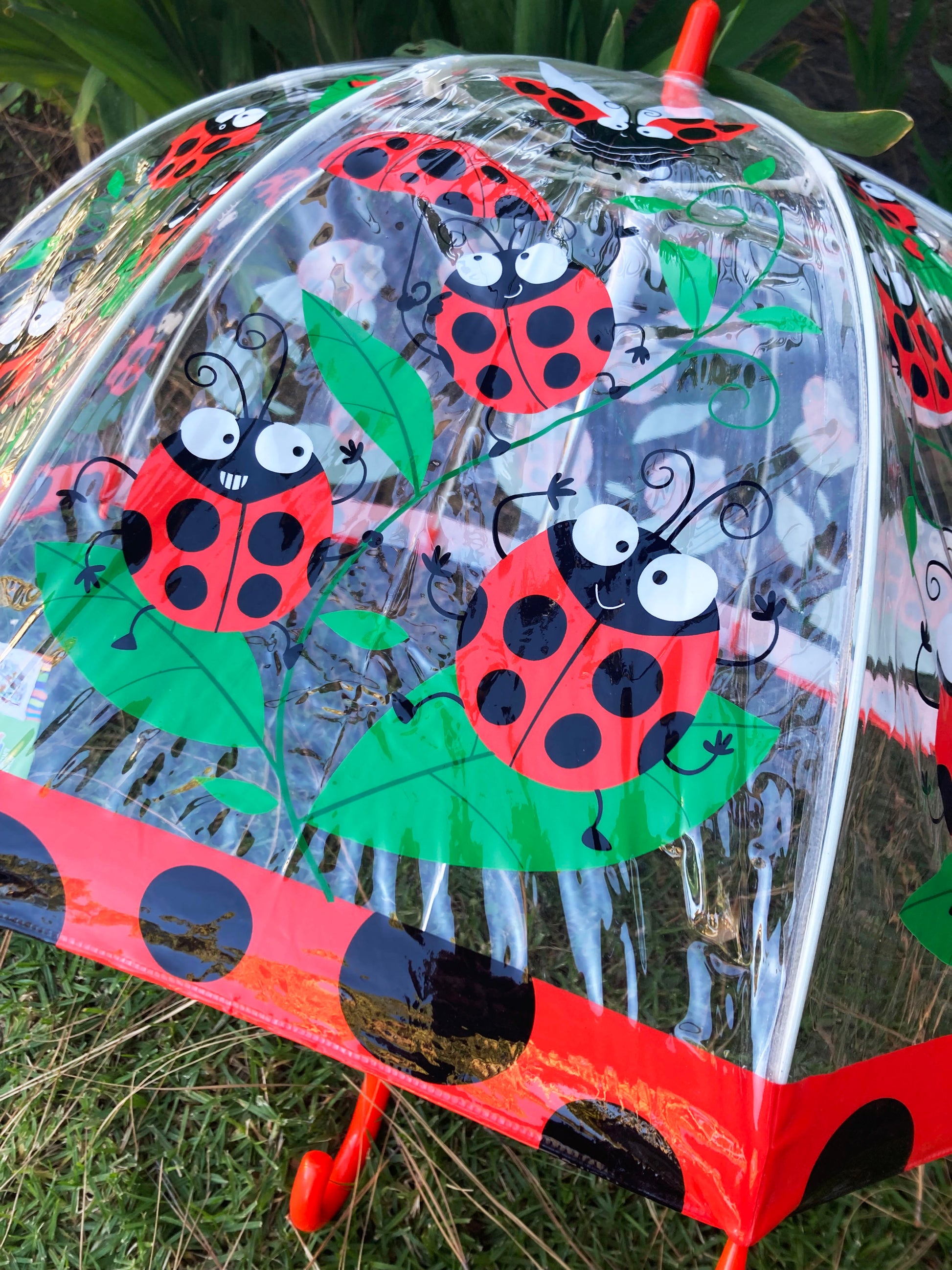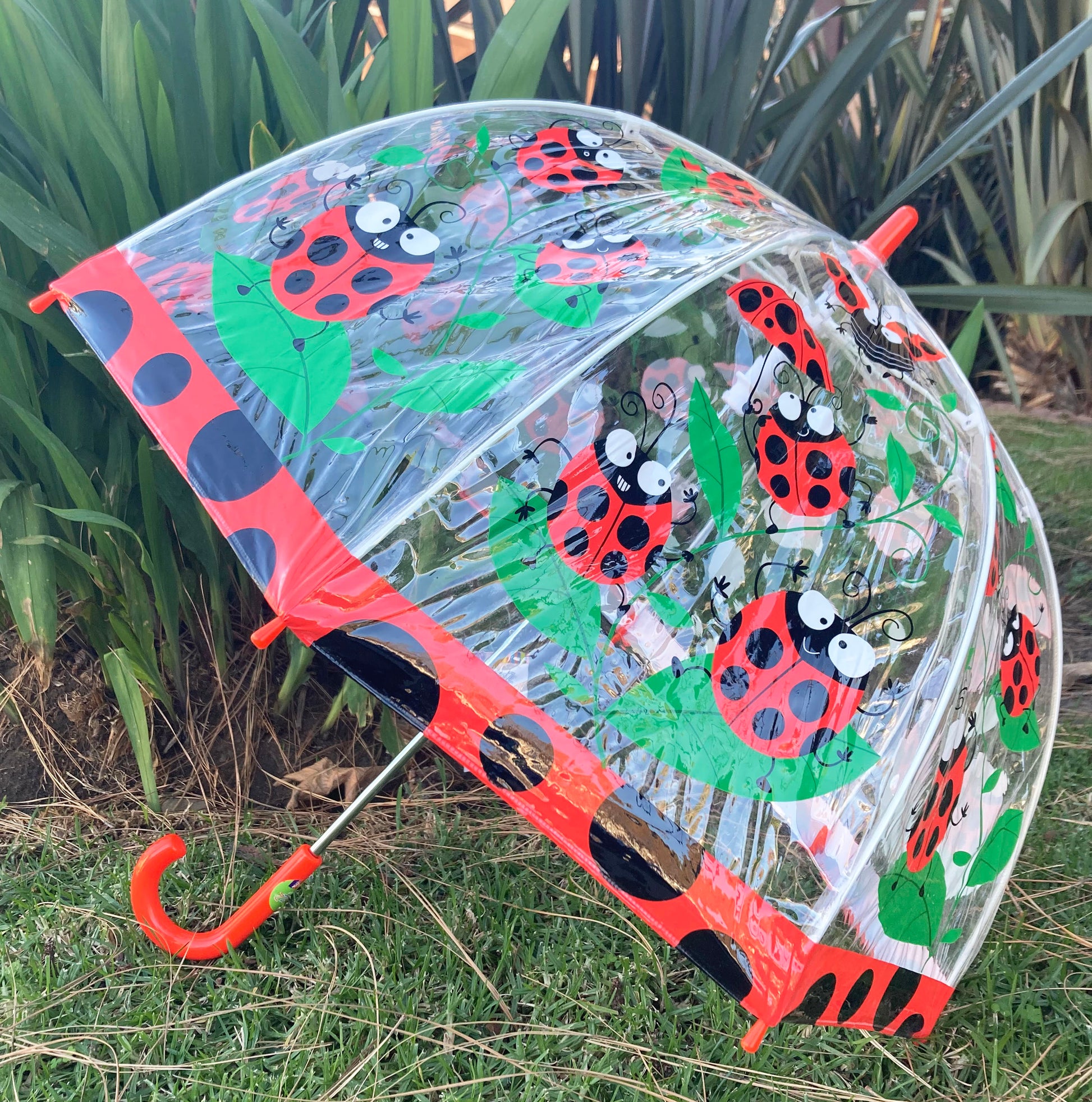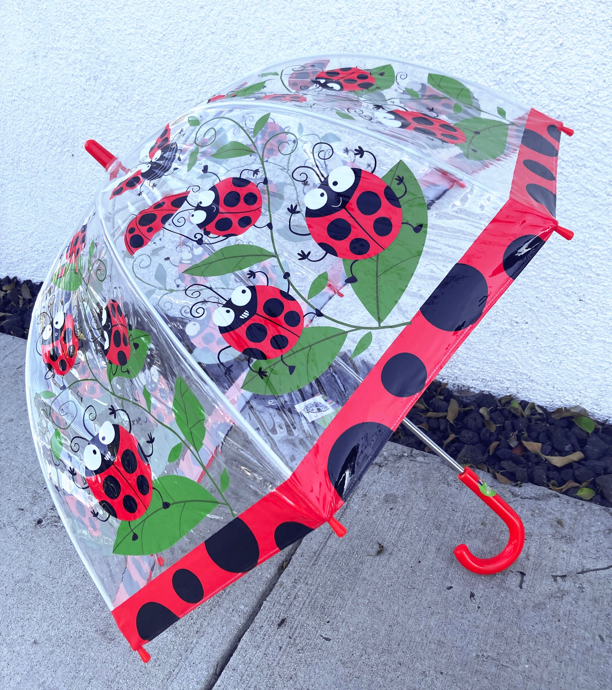Paraguas infantil transparente con forma de mariquita de Bugzz® | Varillas flexibles y puntas seguras | Sistema de fácil apertura y cierre