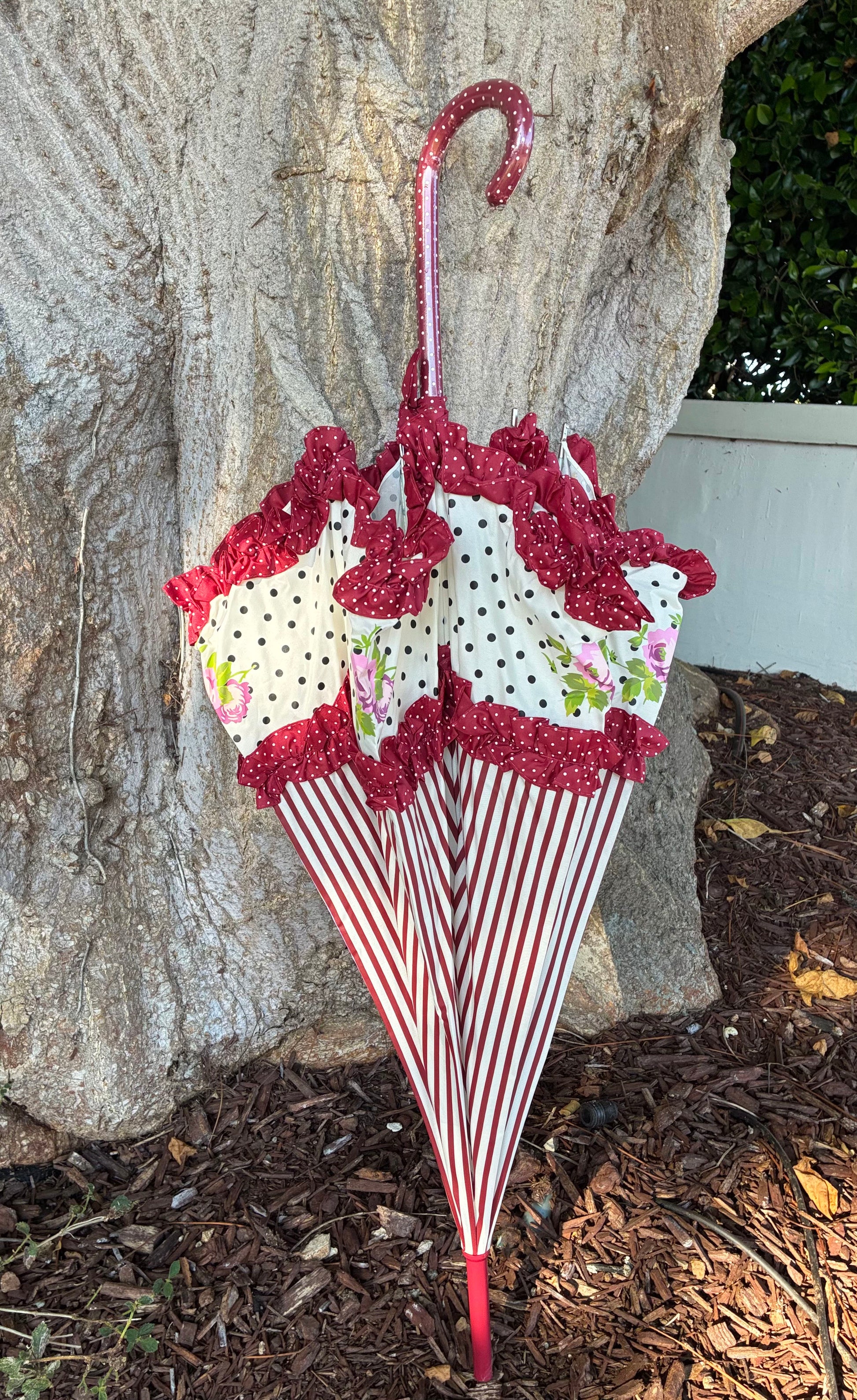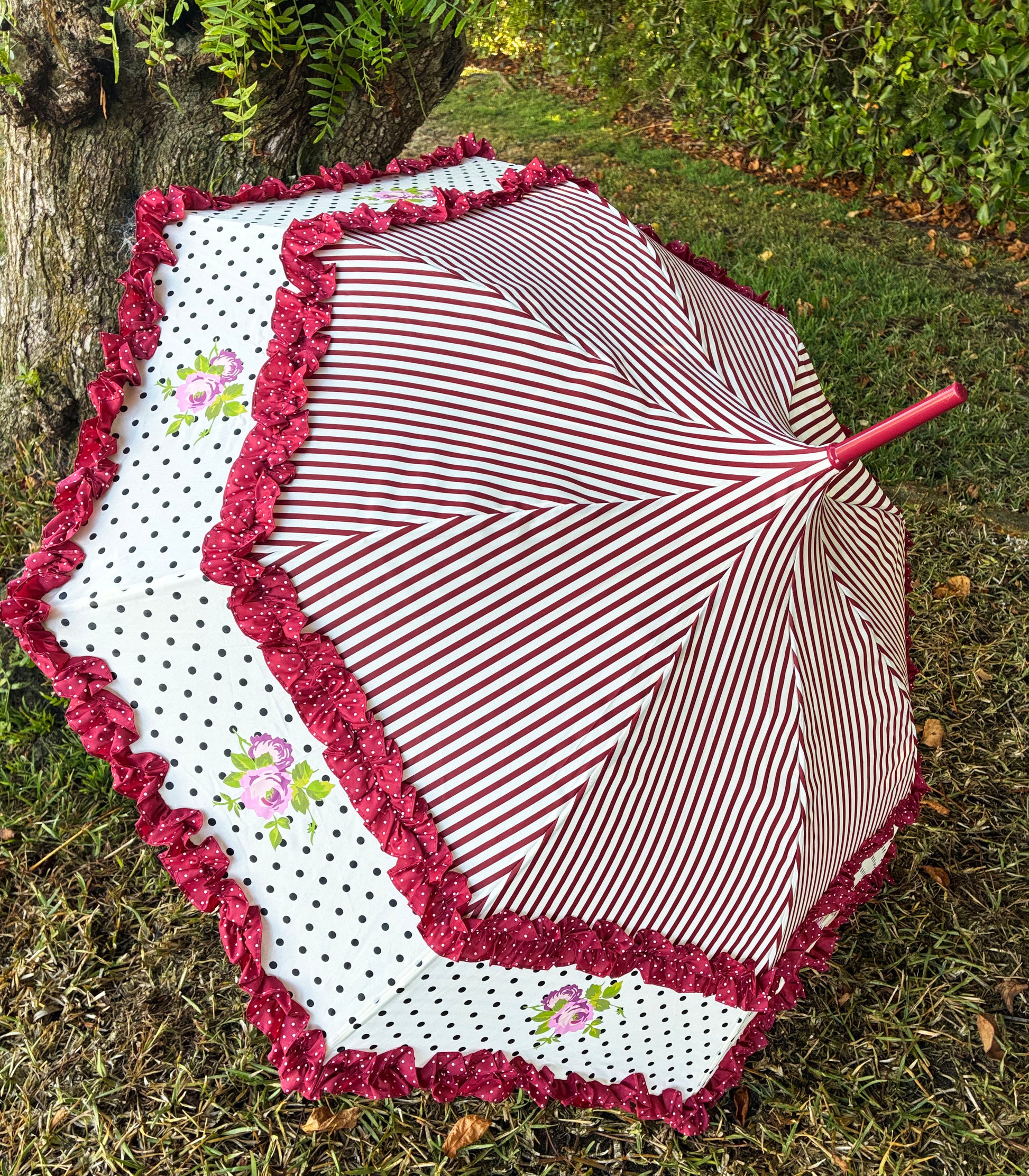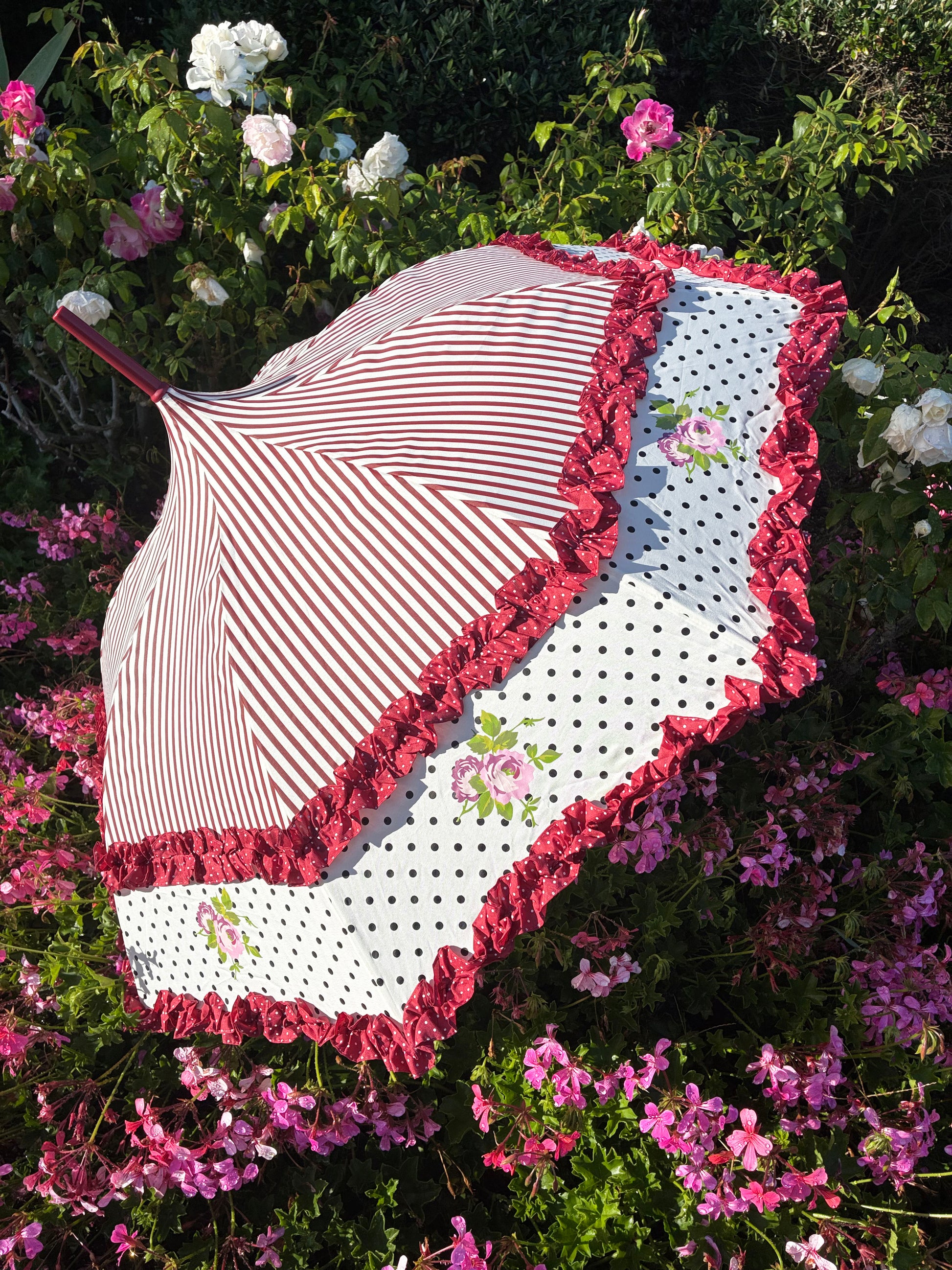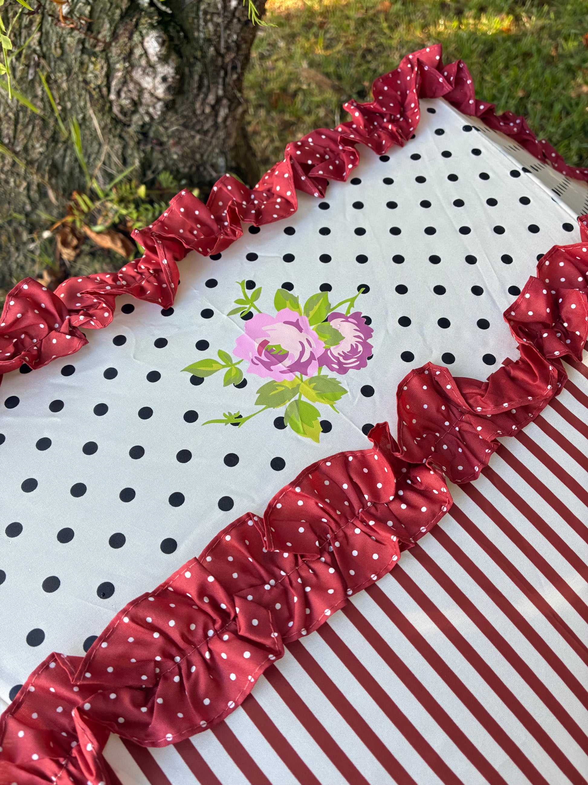 This umbrella is for anyone who sees rainy days as an opportunity to stand out. The bold red stripes, playful polka dots, and vibrant floral accents reflect a personality that loves to mix charm with individuality. The frilled edges add a touch of nostalgia, making it ideal for someone who values timeless elegance with a whimsical twist. Whether it’s a stroll through the city or a garden party in the drizzle, this umbrella invites you to turn heads and bring a little joy to every step you take.