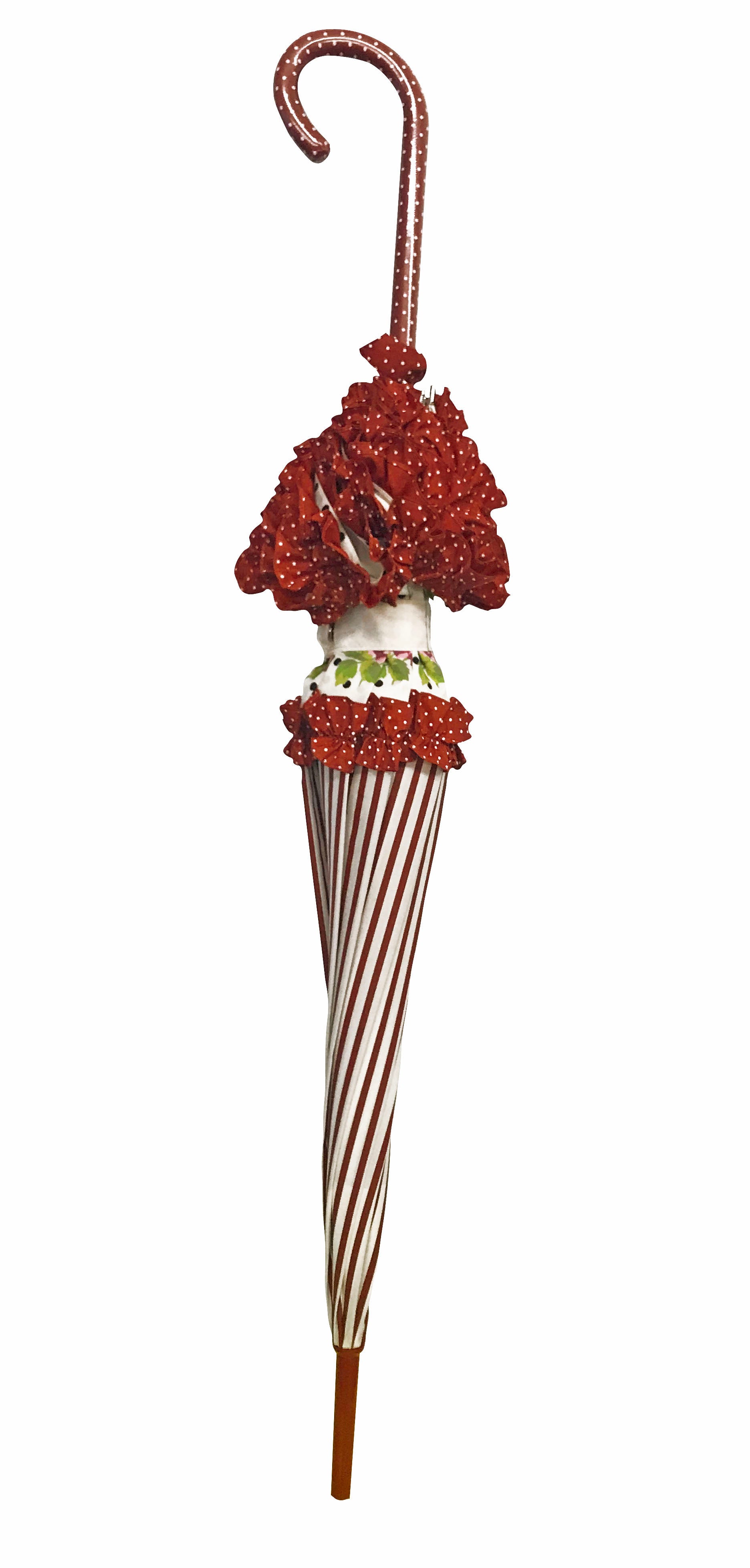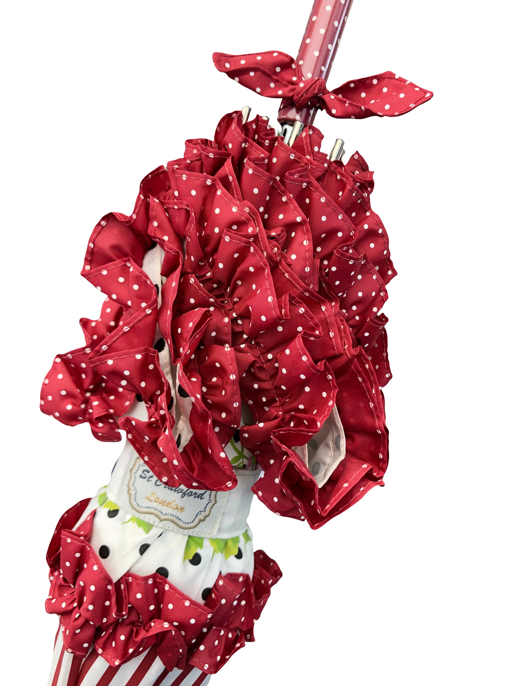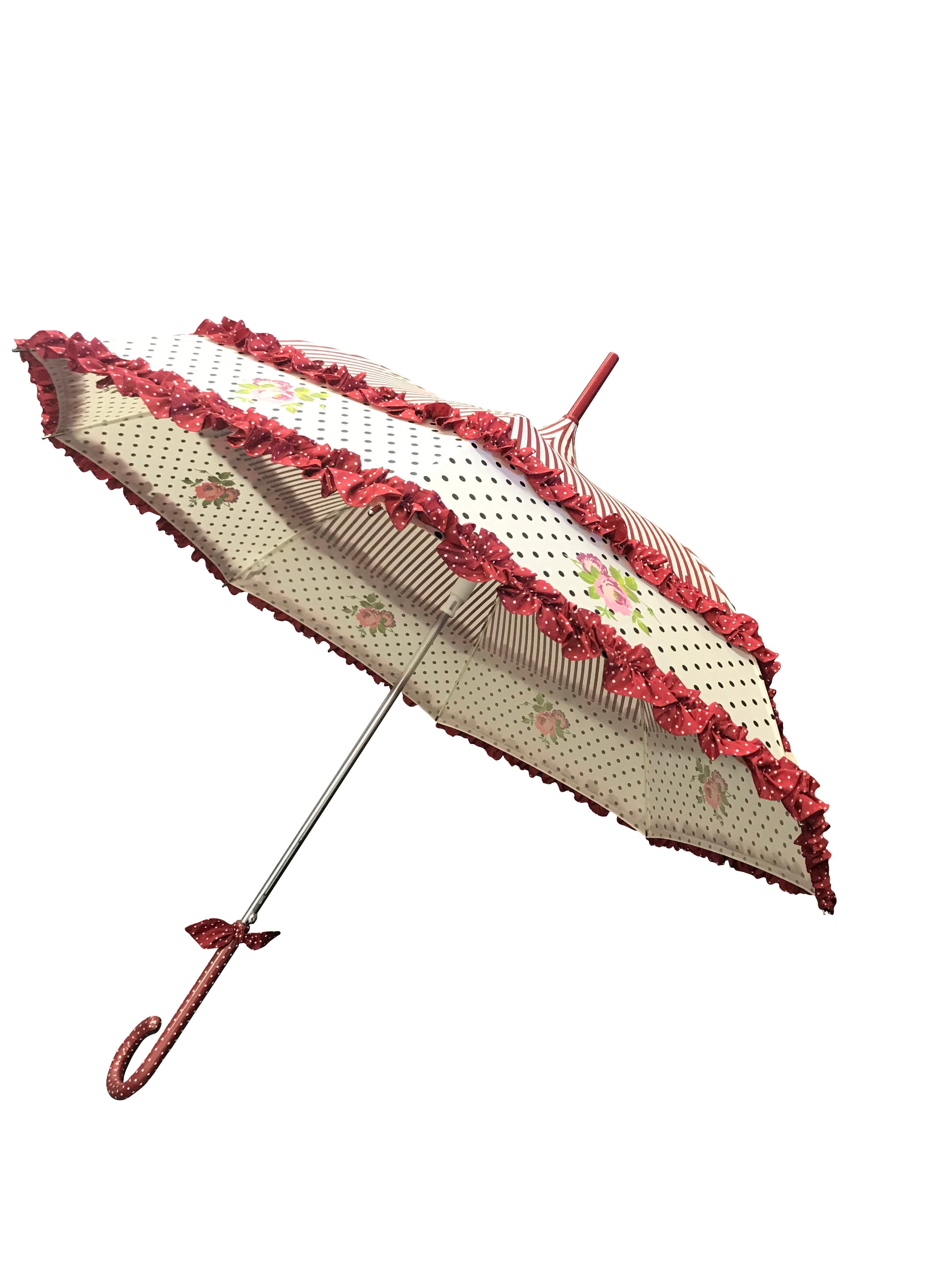 This umbrella is for anyone who sees rainy days as an opportunity to stand out. The bold red stripes, playful polka dots, and vibrant floral accents reflect a personality that loves to mix charm with individuality. The frilled edges add a touch of nostalgia, making it ideal for someone who values timeless elegance with a whimsical twist. Whether it’s a stroll through the city or a garden party in the drizzle, this umbrella invites you to turn heads and bring a little joy to every step you take.