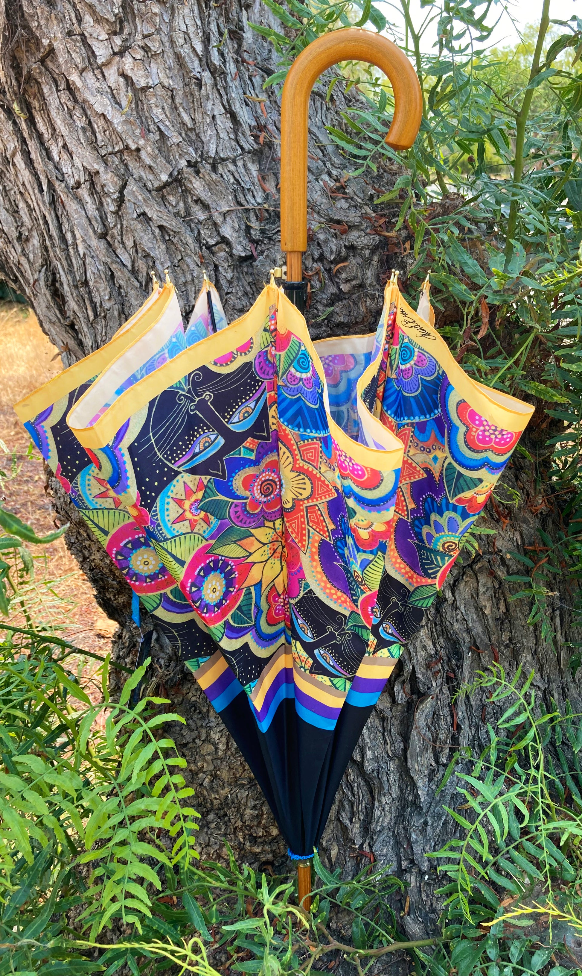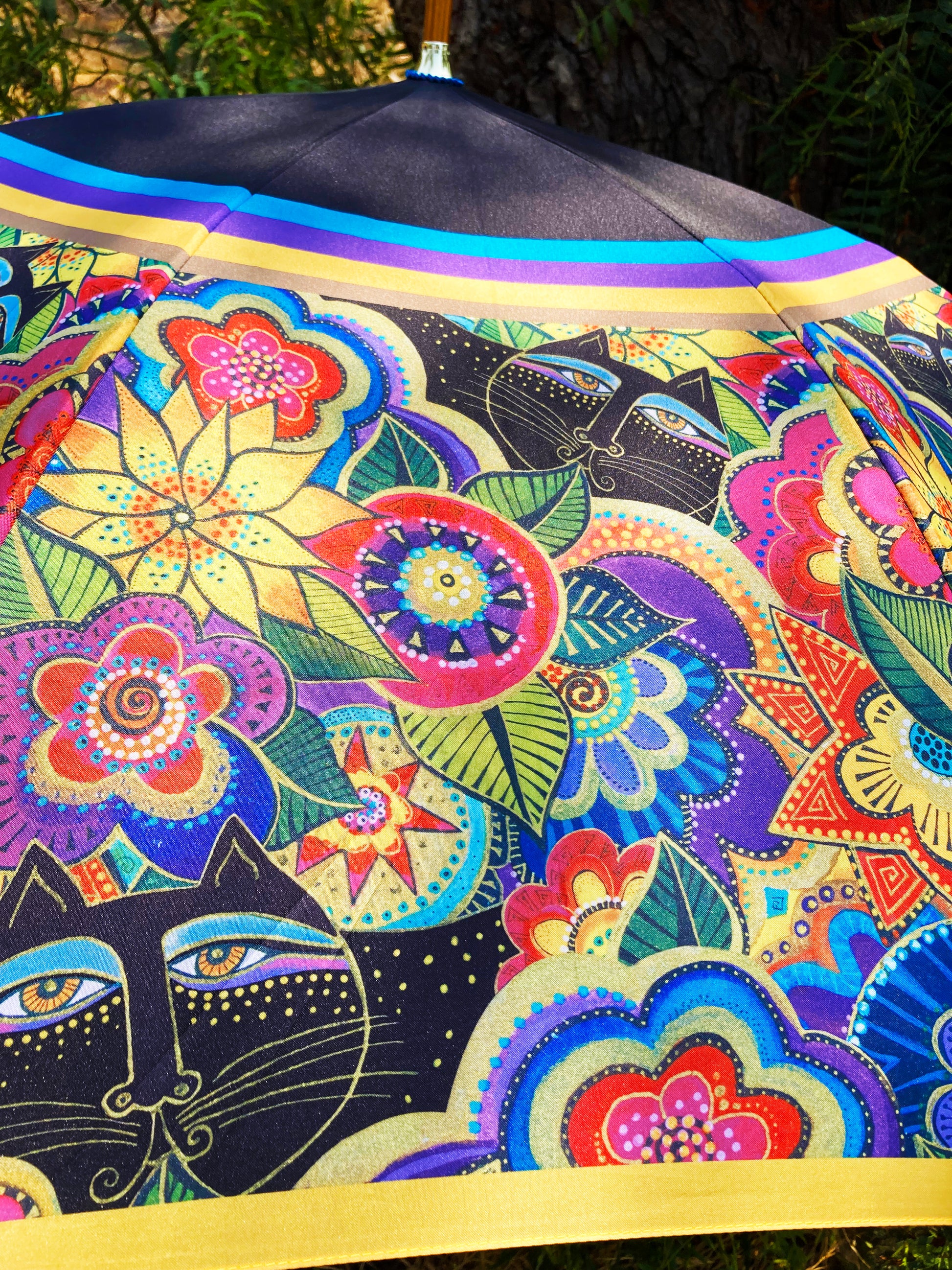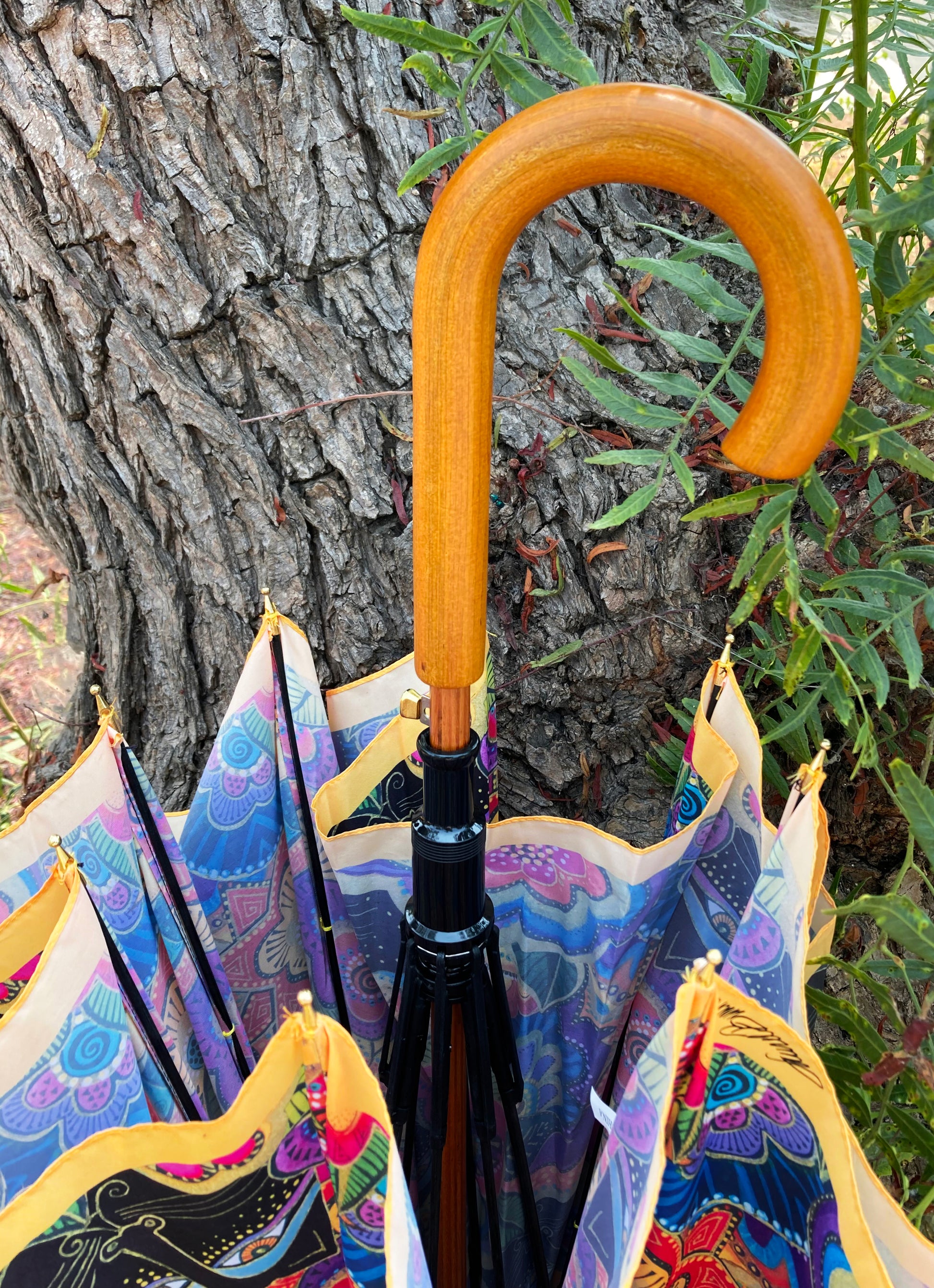 Laurel Burch umbrellas blend vivid color with whimsical art, turning everyday rain gear into joyful, wearable stories. From playful cats to celestial designs, each piece reflects her bold, creative spirit.