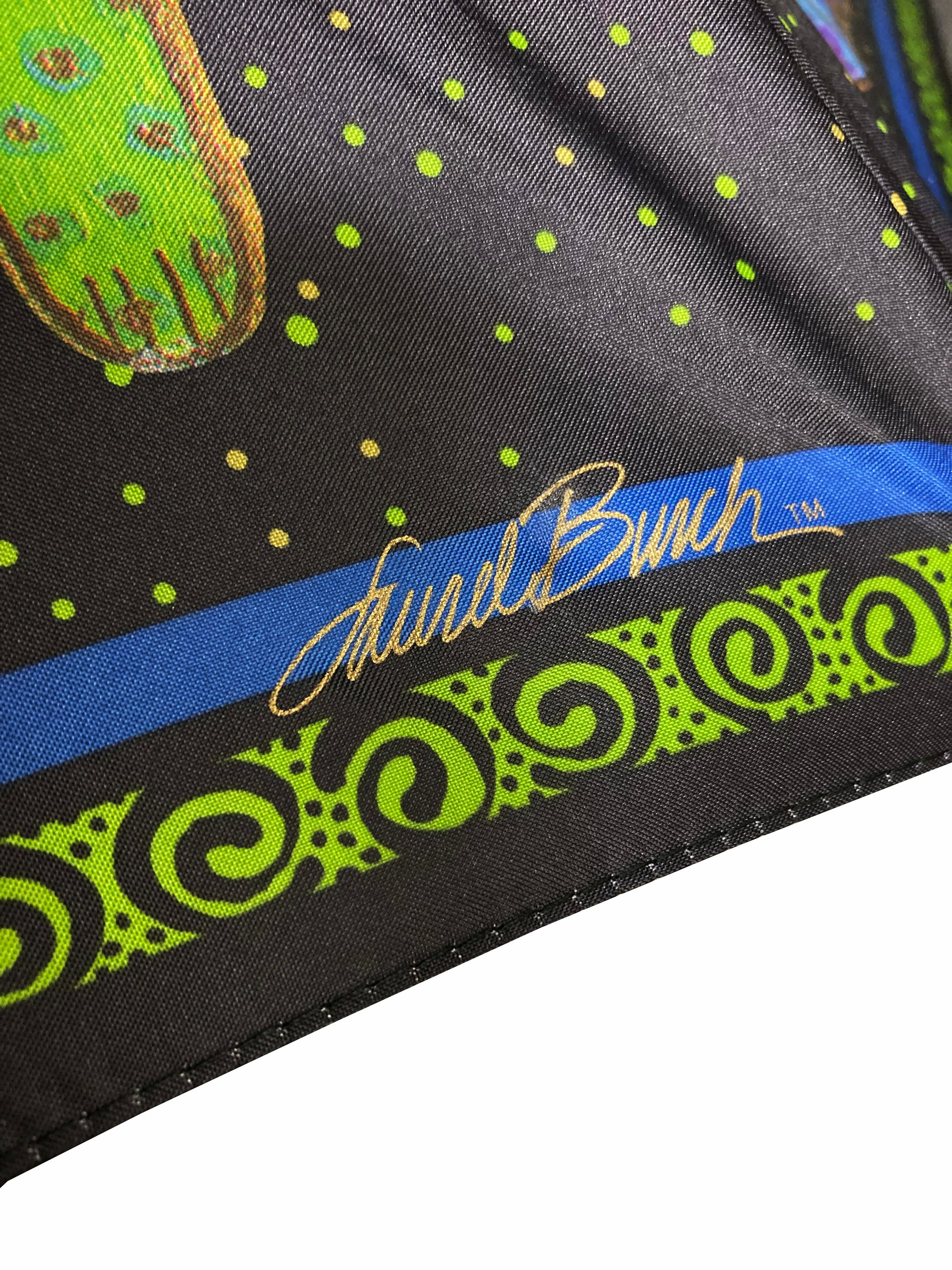This umbrella is a joyful tribute to loyalty and love. Laurel Burch’s signature dogs, painted in radiant purples, blues, and greens, gaze out from a starry black canopy with soulful eyes and playful charm. Wrapped in swirls, flowers, and color-soaked patterns, these pups feel like protectors of the heart