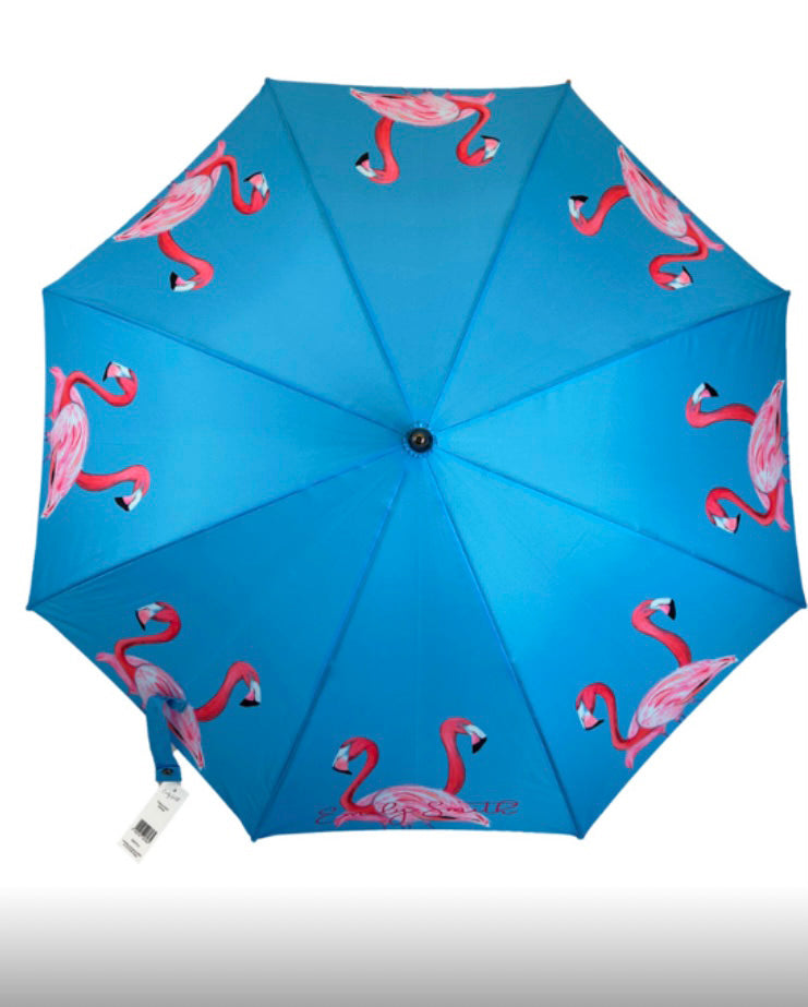 Add a splash of tropical elegance to rainy days with this Emily Smith flamingo umbrella, crafted from quick-dry polyester. The vibrant blue canopy adorned with graceful pink flamingos showcases the collection's signature blend of bold animal-inspired designs and exceptional craftsmanship. Lightweight yet durable, this umbrella is the perfect companion for staying stylish and dry, offering a delightful touch of nature-inspired charm.
