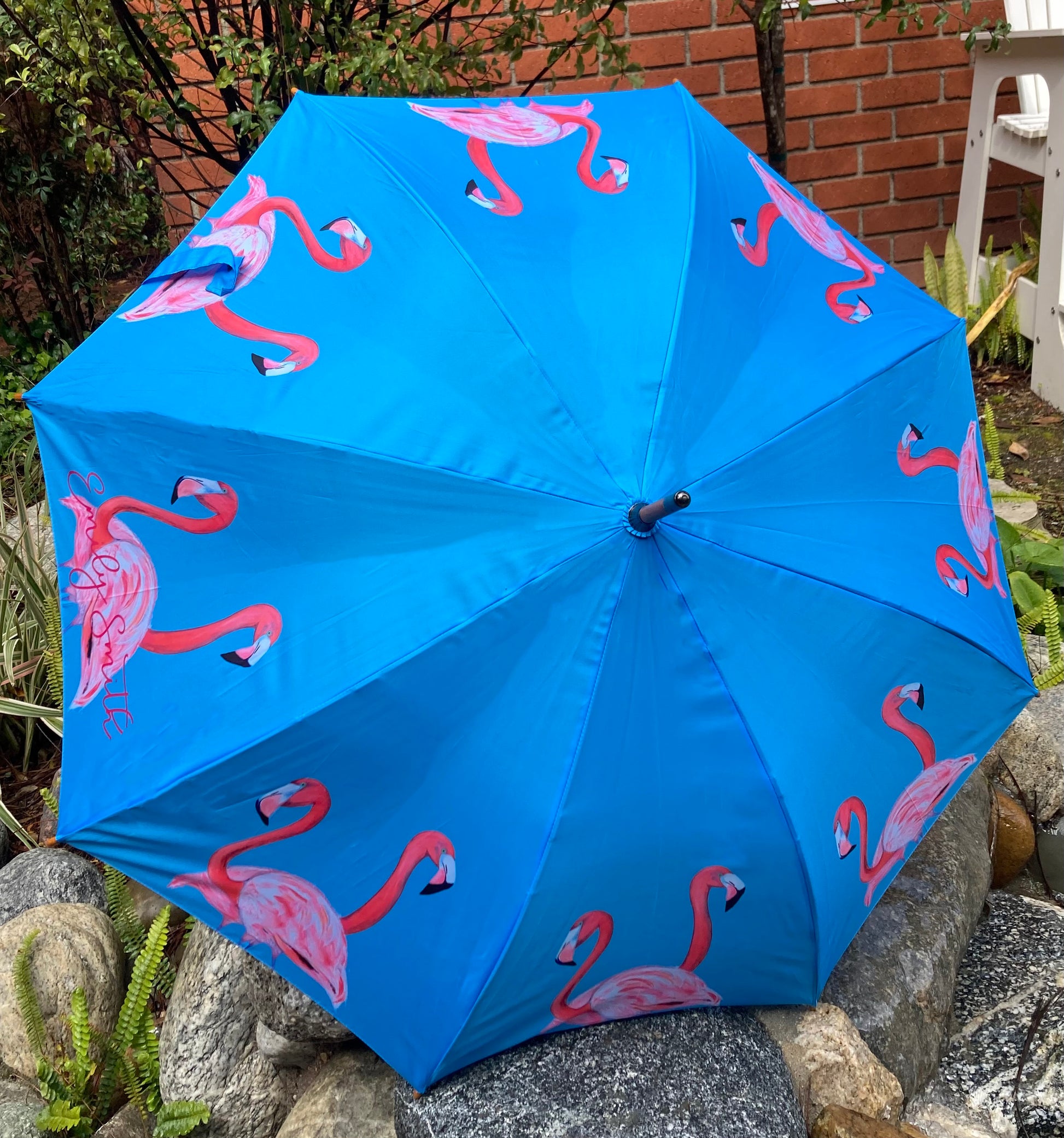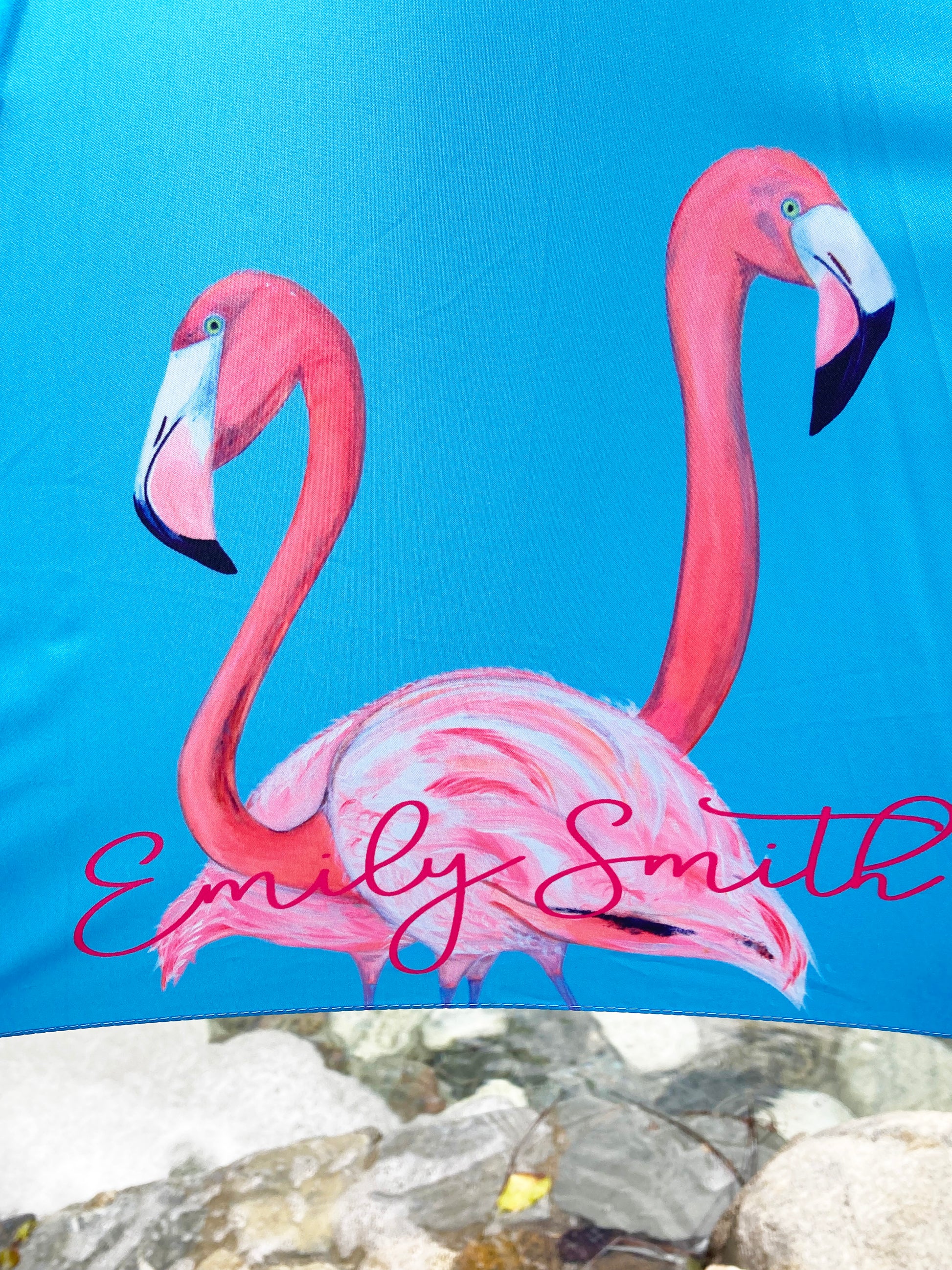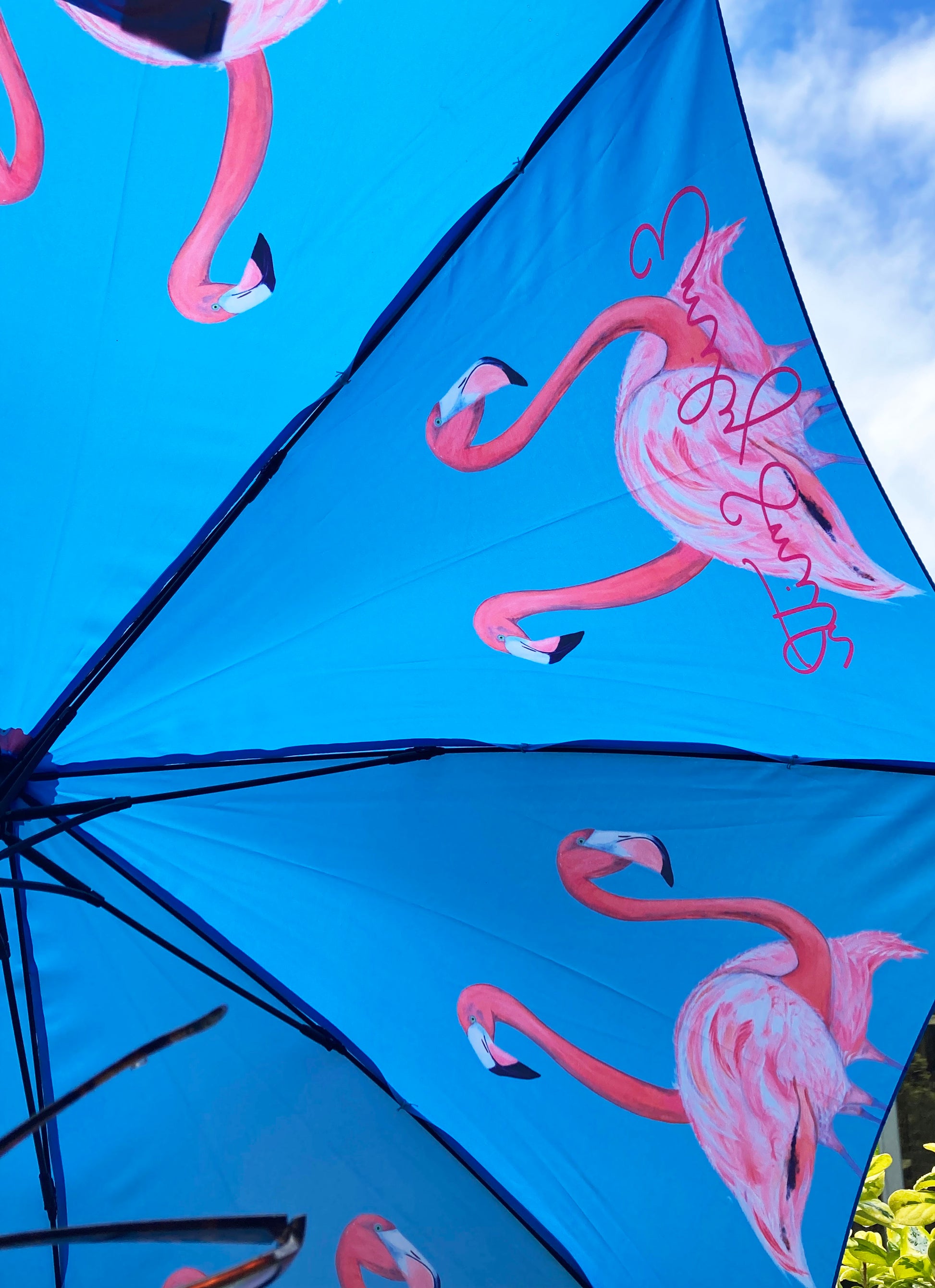 Flamingo Umbrella by Emily Smith England | Flossy and Amber Blue and Pink Design