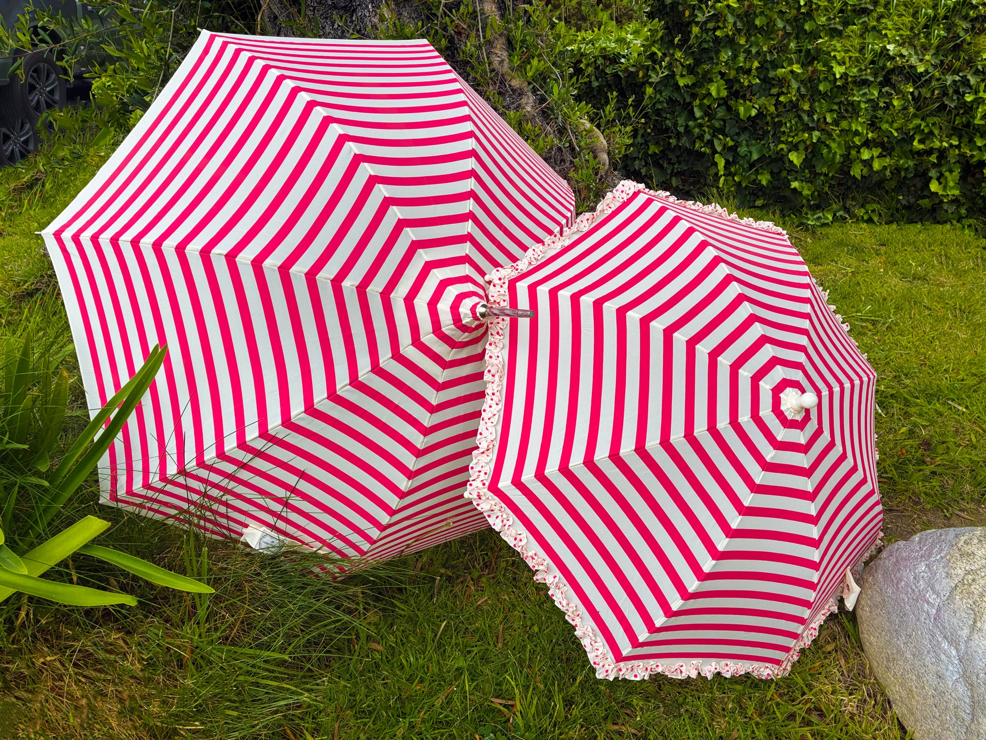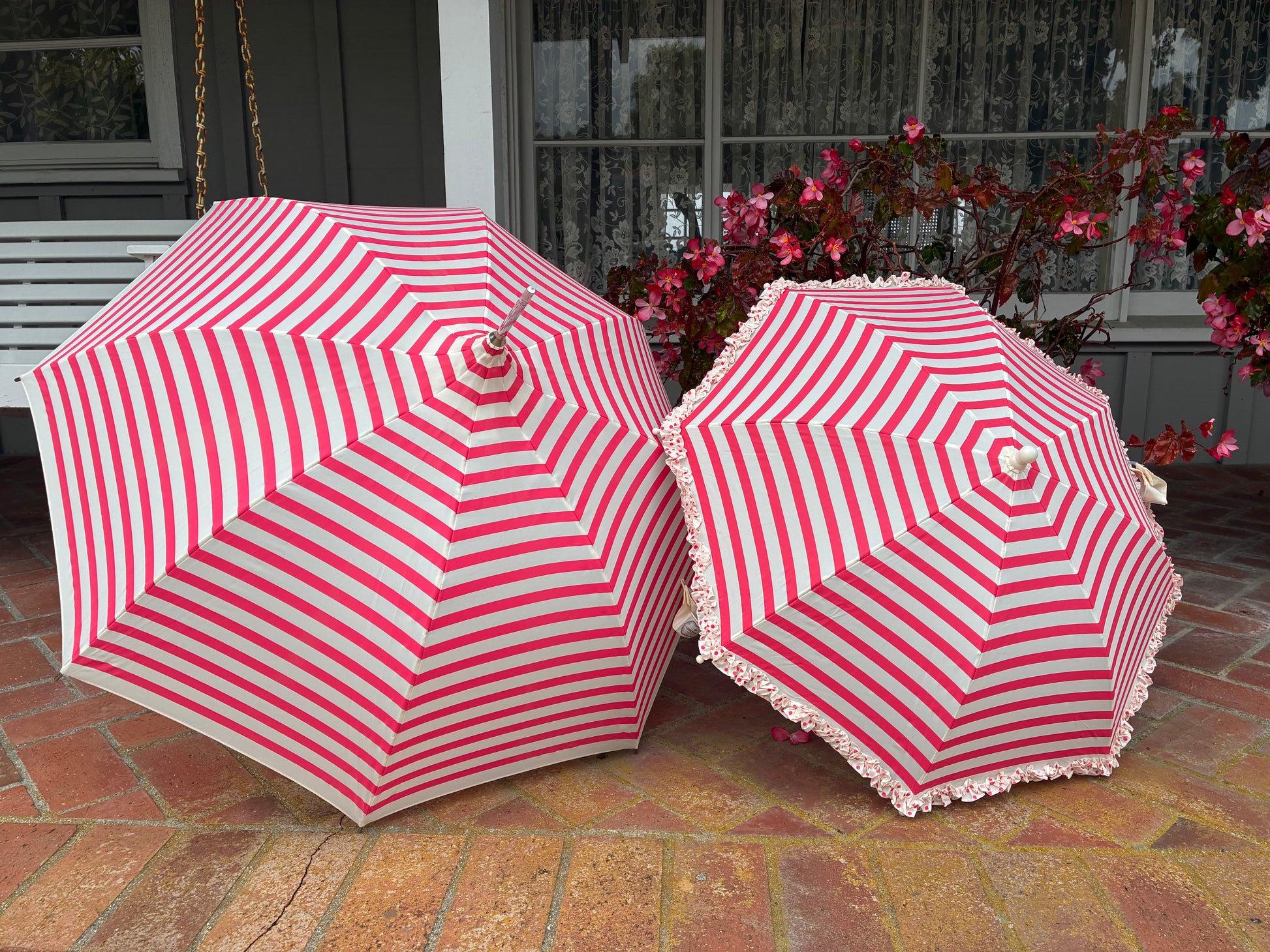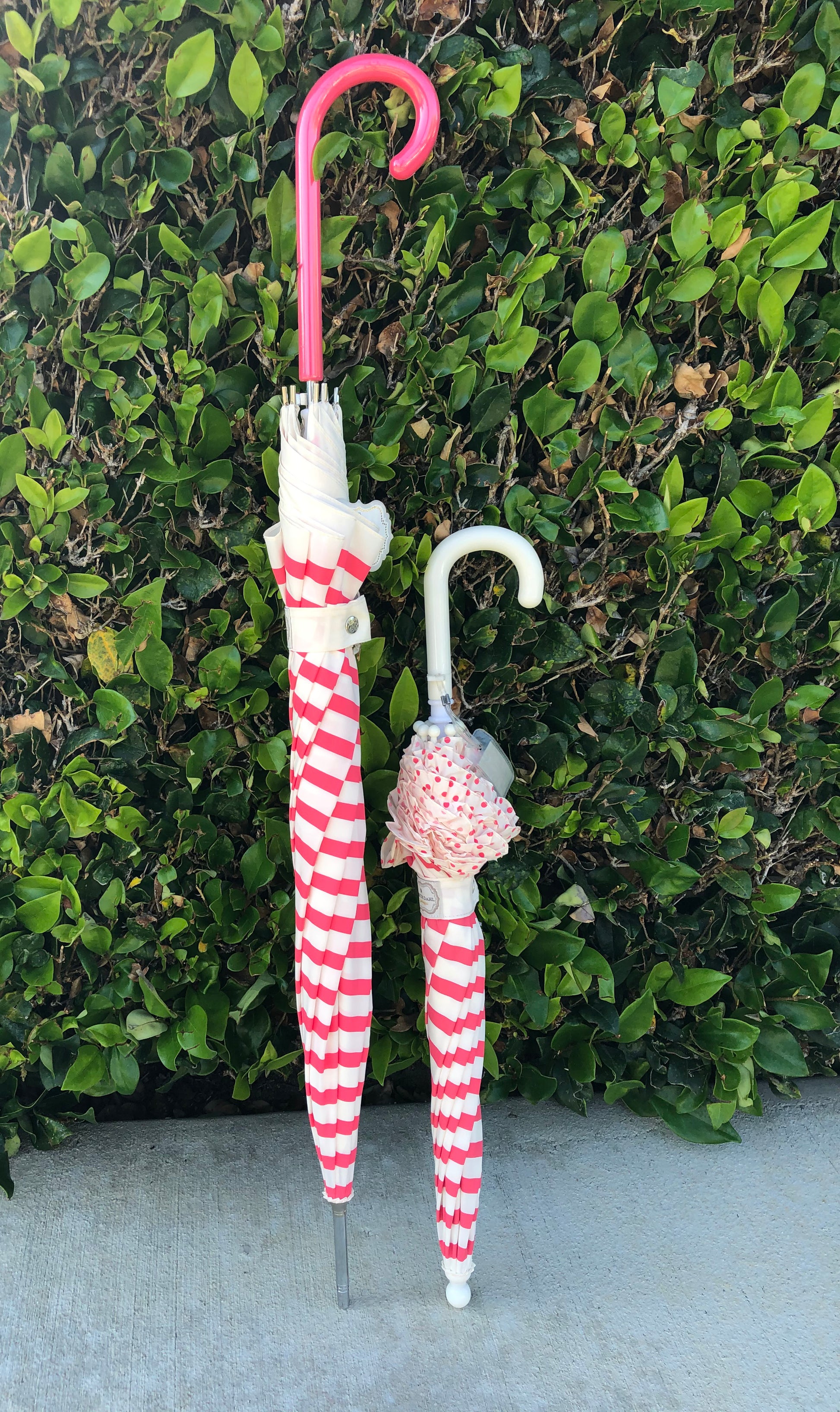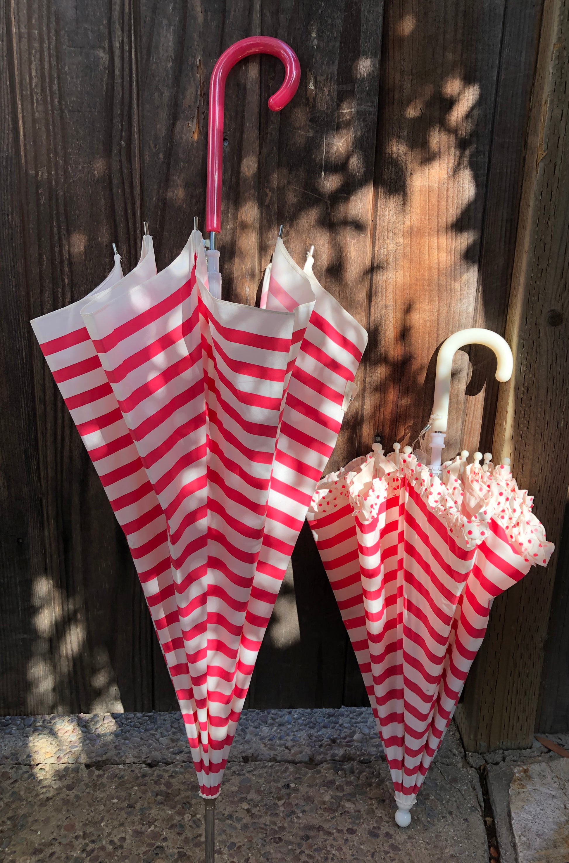 Introducing the charming "Mommy and Me" umbrella set from Lisbeth Dahl, designed to add a touch of elegance and joy to any rainy day. This delightful duo features matching pink and white striped patterns that are sure to brighten the mood. The adult umbrella boasts an elegant dome shape with an automatic opening mechanism for convenience, while the child's version is adorned with cute ruffles and a manual opening system that's easy for little hands to operate. Safety is a priority; the child's umbrella is thoughtfully finished with a smooth tip and safe rib tips to ensure a worry-free experience. Perfect for stylish mothers and their little ones, this set not only keeps you dry but also turns heads with its chic, synchronized look.