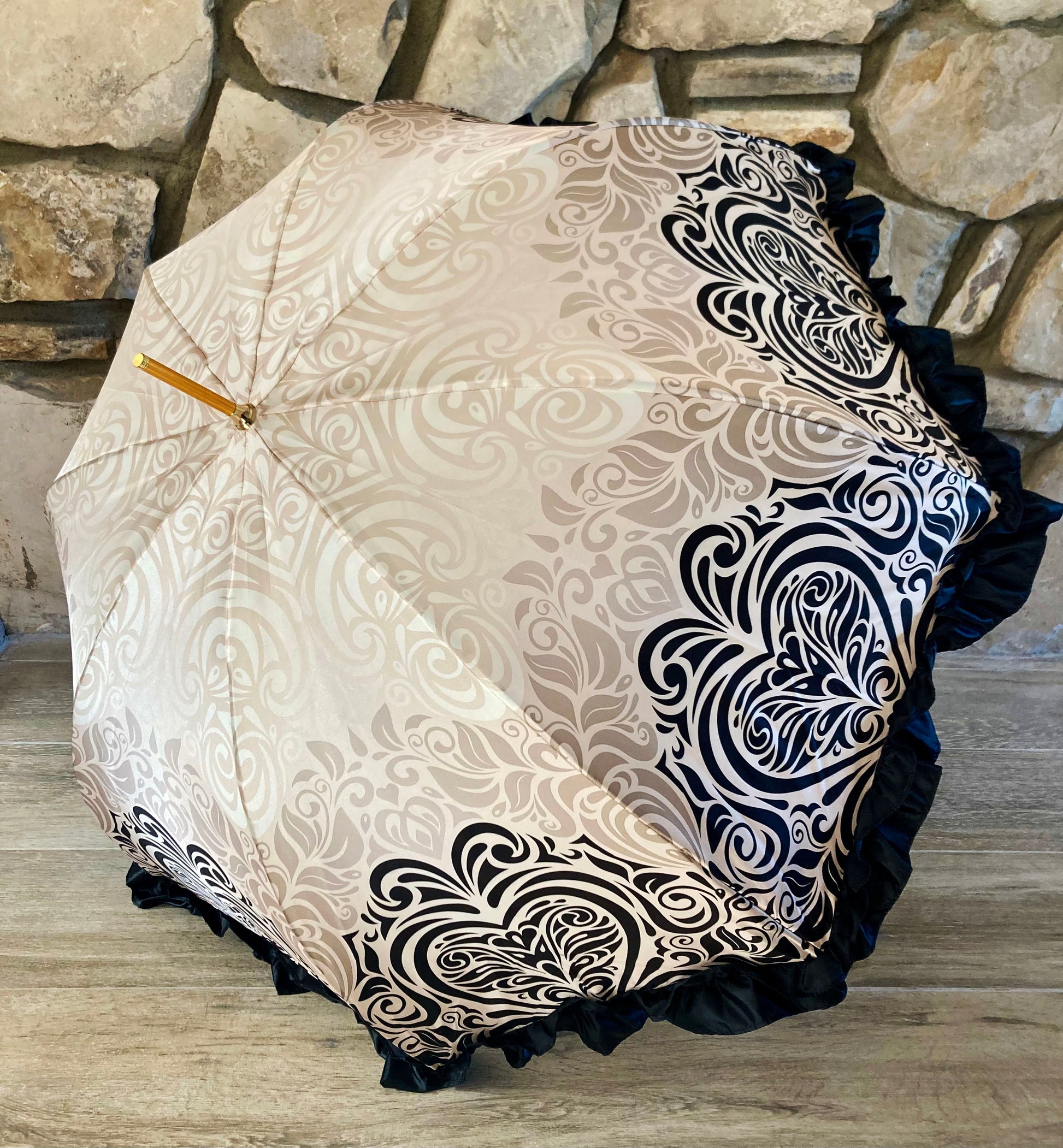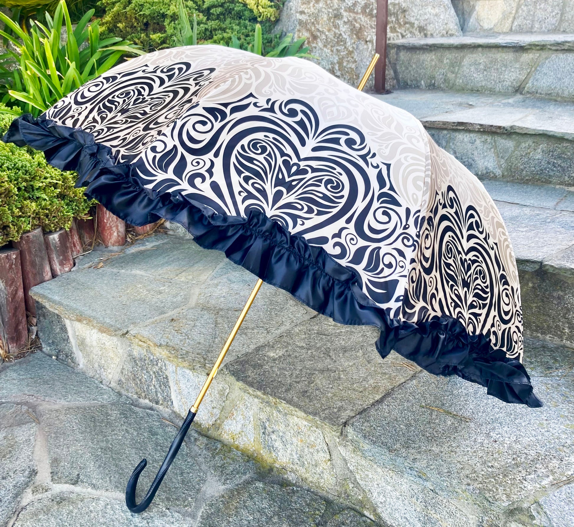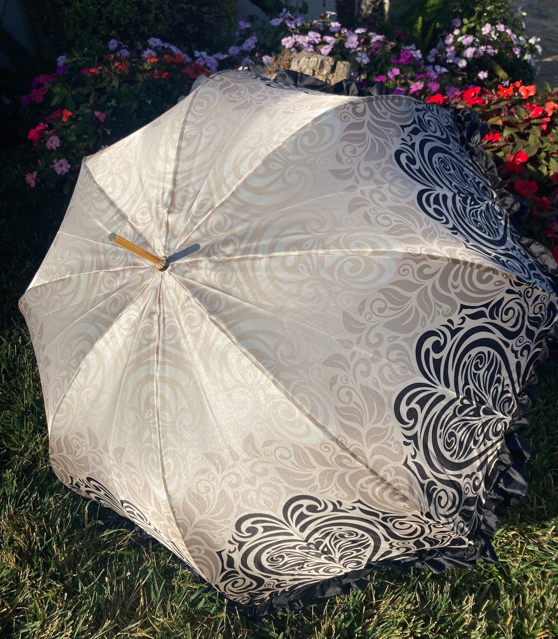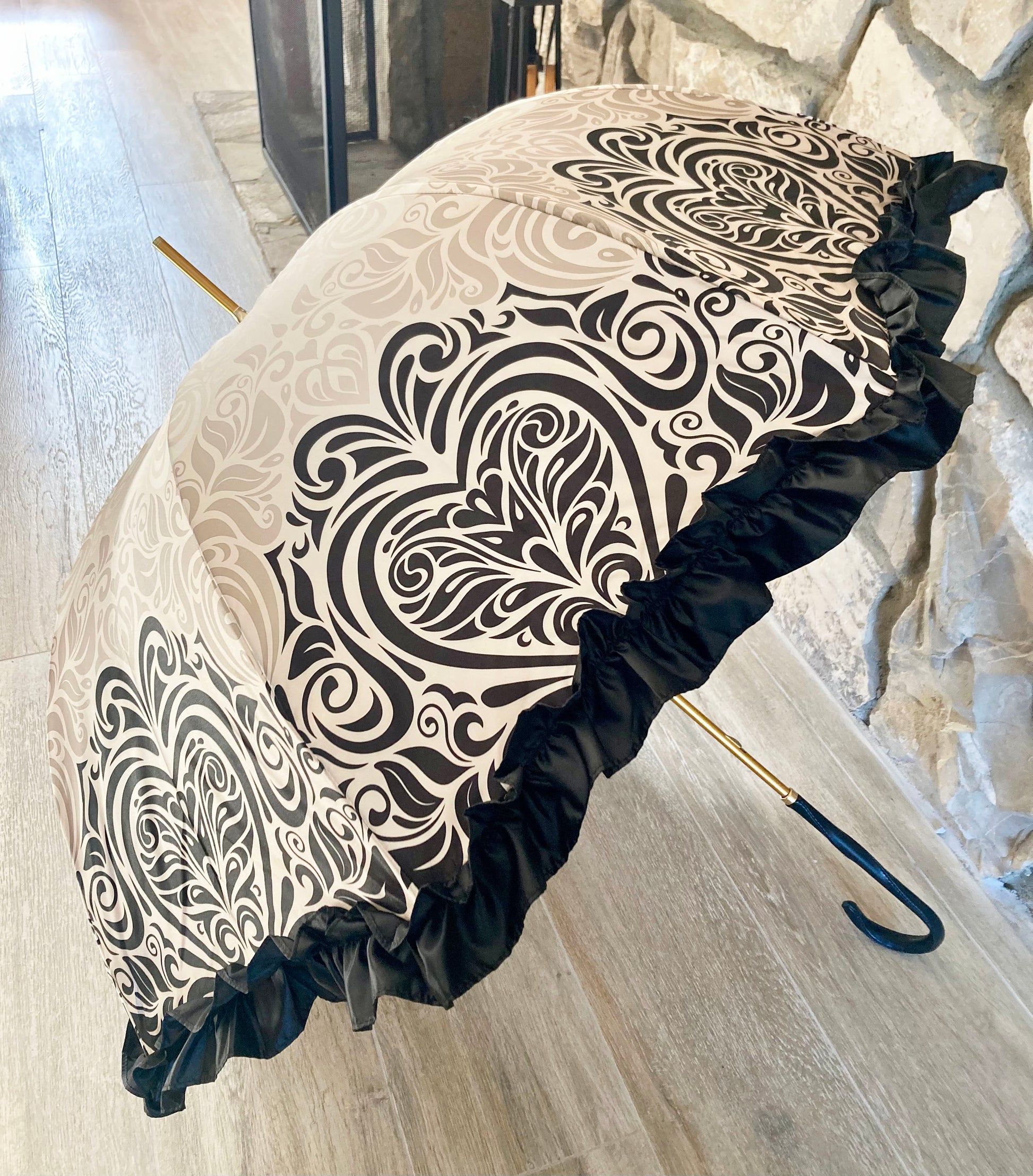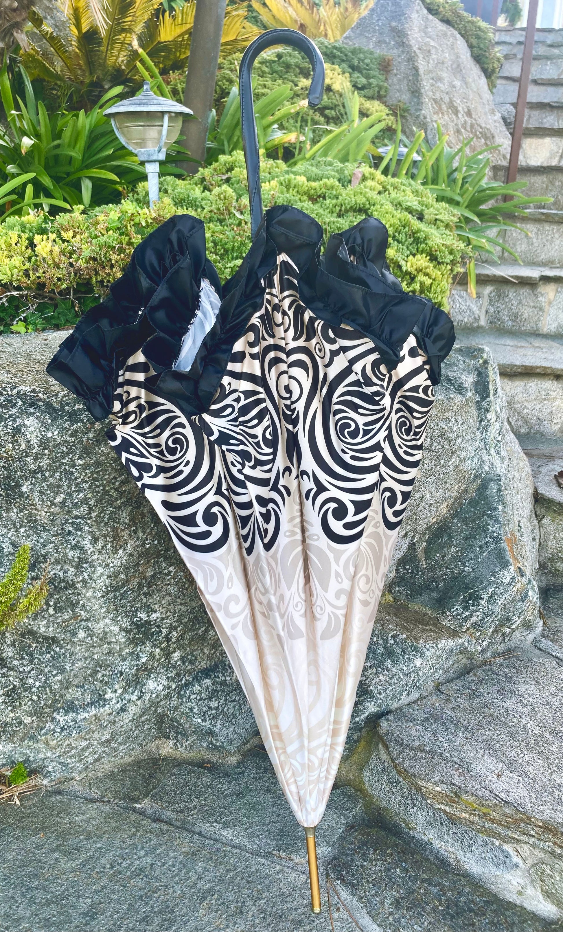 The umbrella features a canopy patterned with intricate ivory and beige swirls on smooth satin-like fabric, finished with a black satin ruffle trim along the edge. The handle is smoothly curved, wrapped in stitched black leather. The shaft and tip have a polished gold finish.