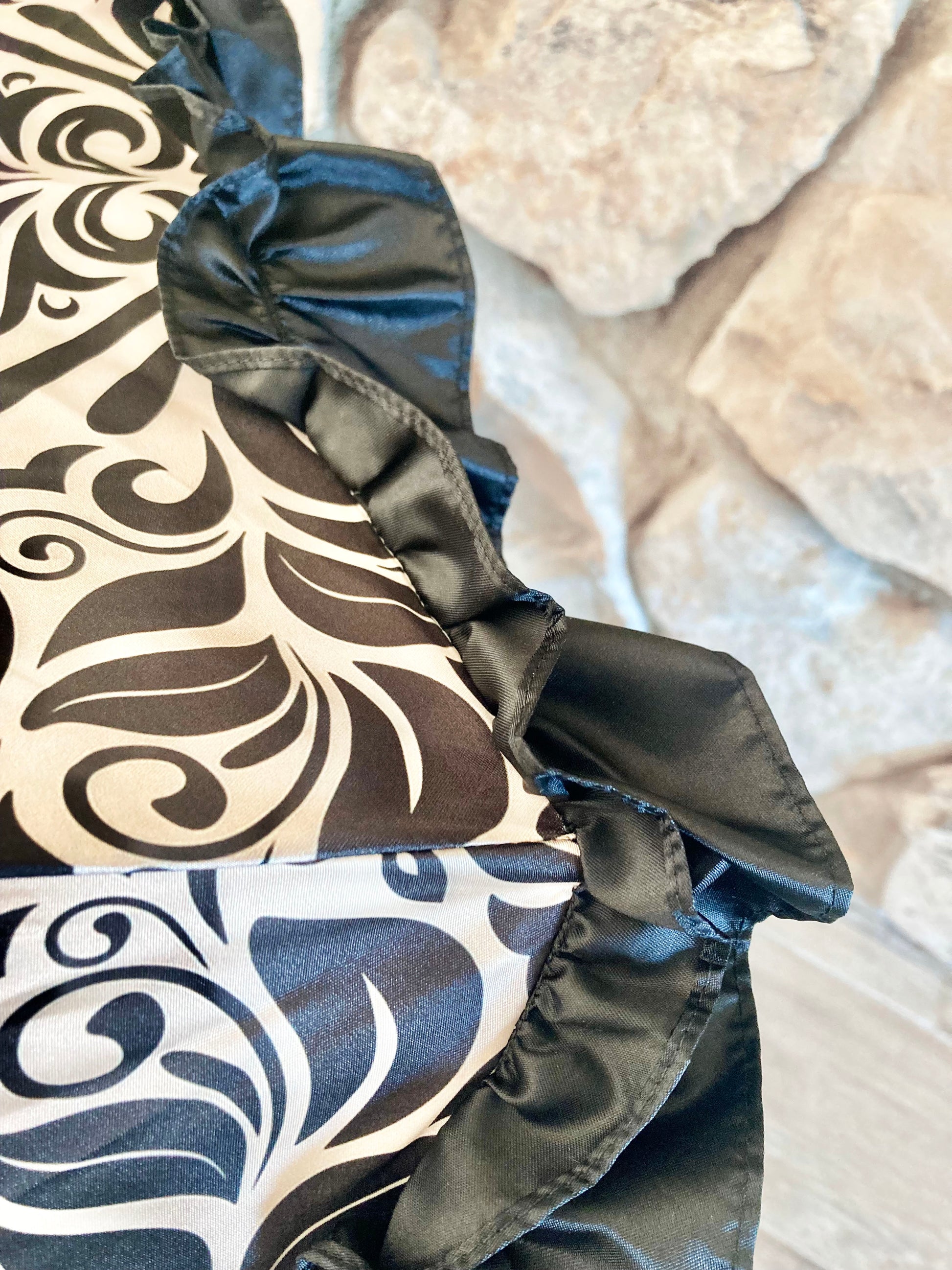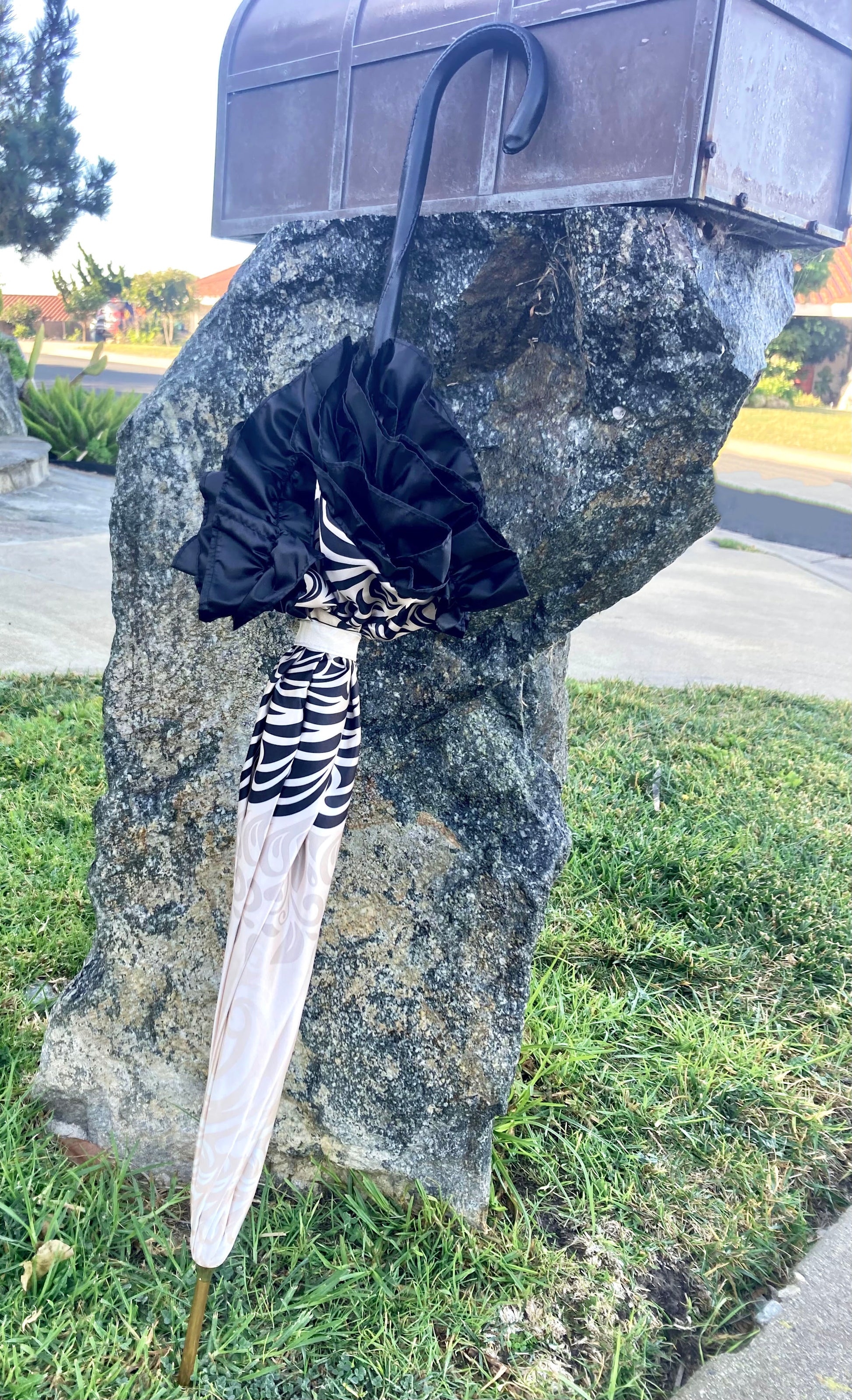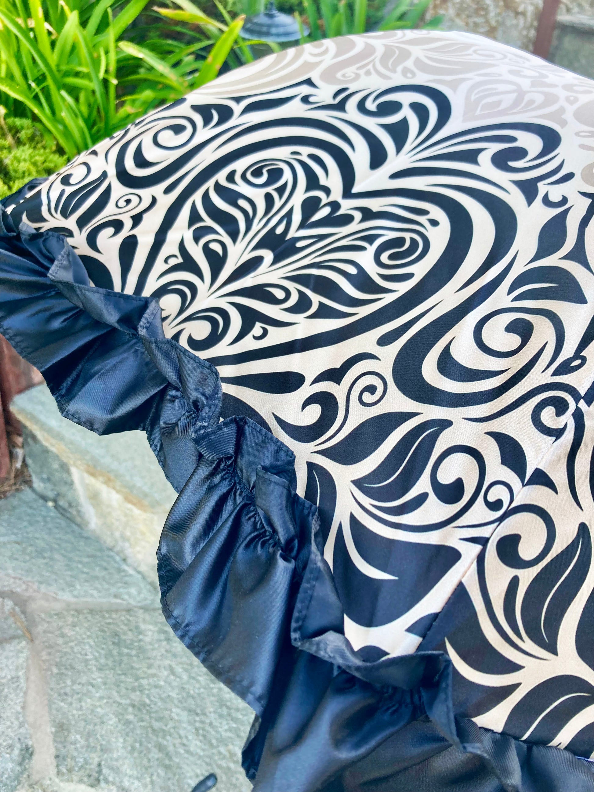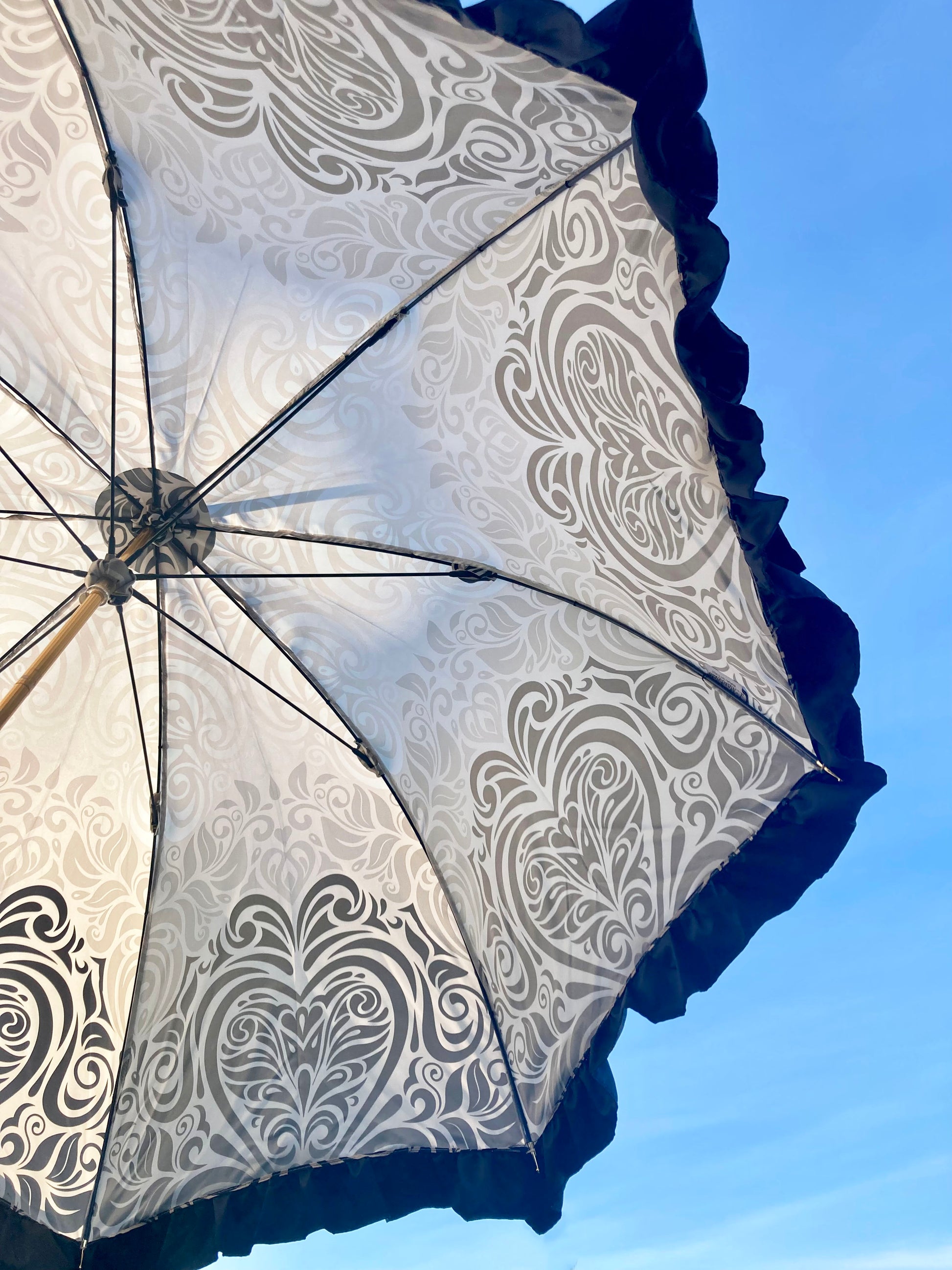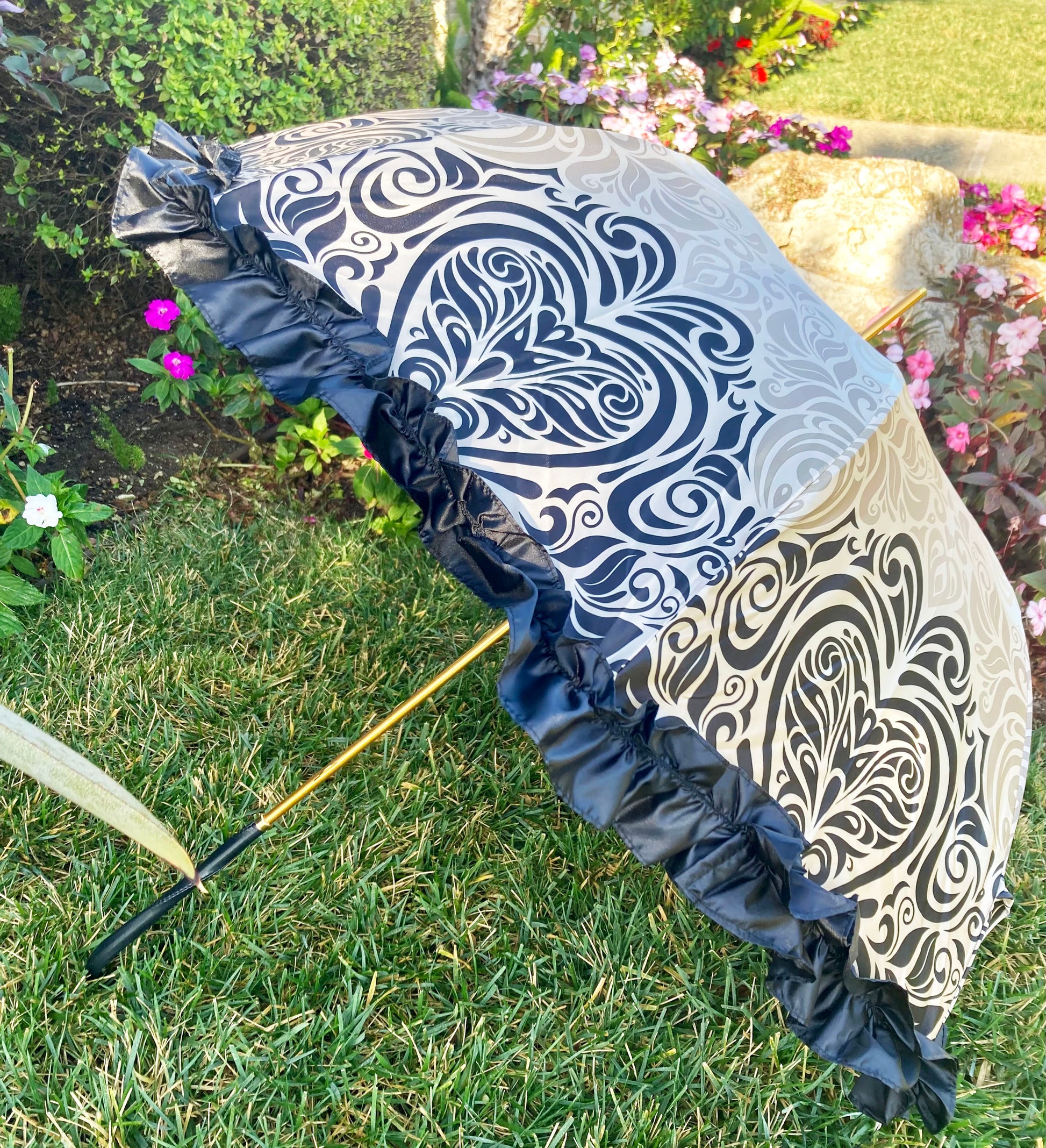 The umbrella features a canopy patterned with intricate ivory and beige swirls on smooth satin-like fabric, finished with a black satin ruffle trim along the edge. The handle is smoothly curved, wrapped in stitched black leather. The shaft and tip have a polished gold finish.