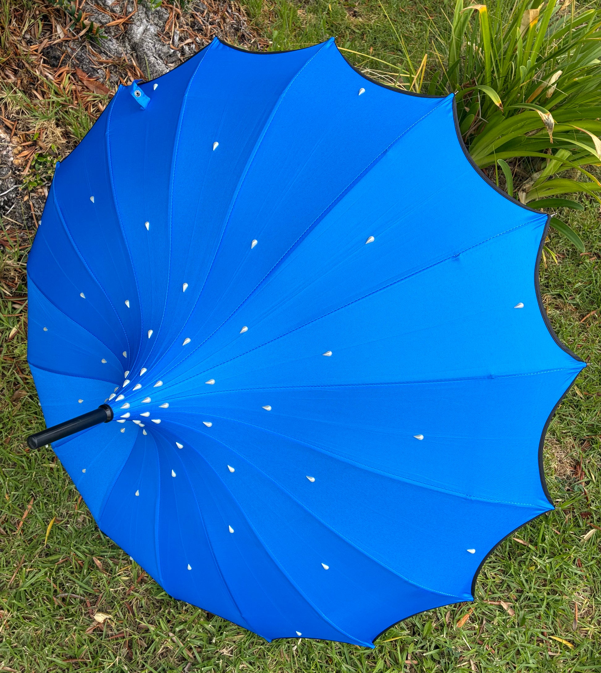 A vibrant cobalt pagoda with 16 scalloped edges, set with 64 pearl-white teardrops that gather toward the finial - as if rain paused mid-air. It carries like jewelry you can walk under - refined, a touch unexpected, fully waterproof and flattering in sun or shade.