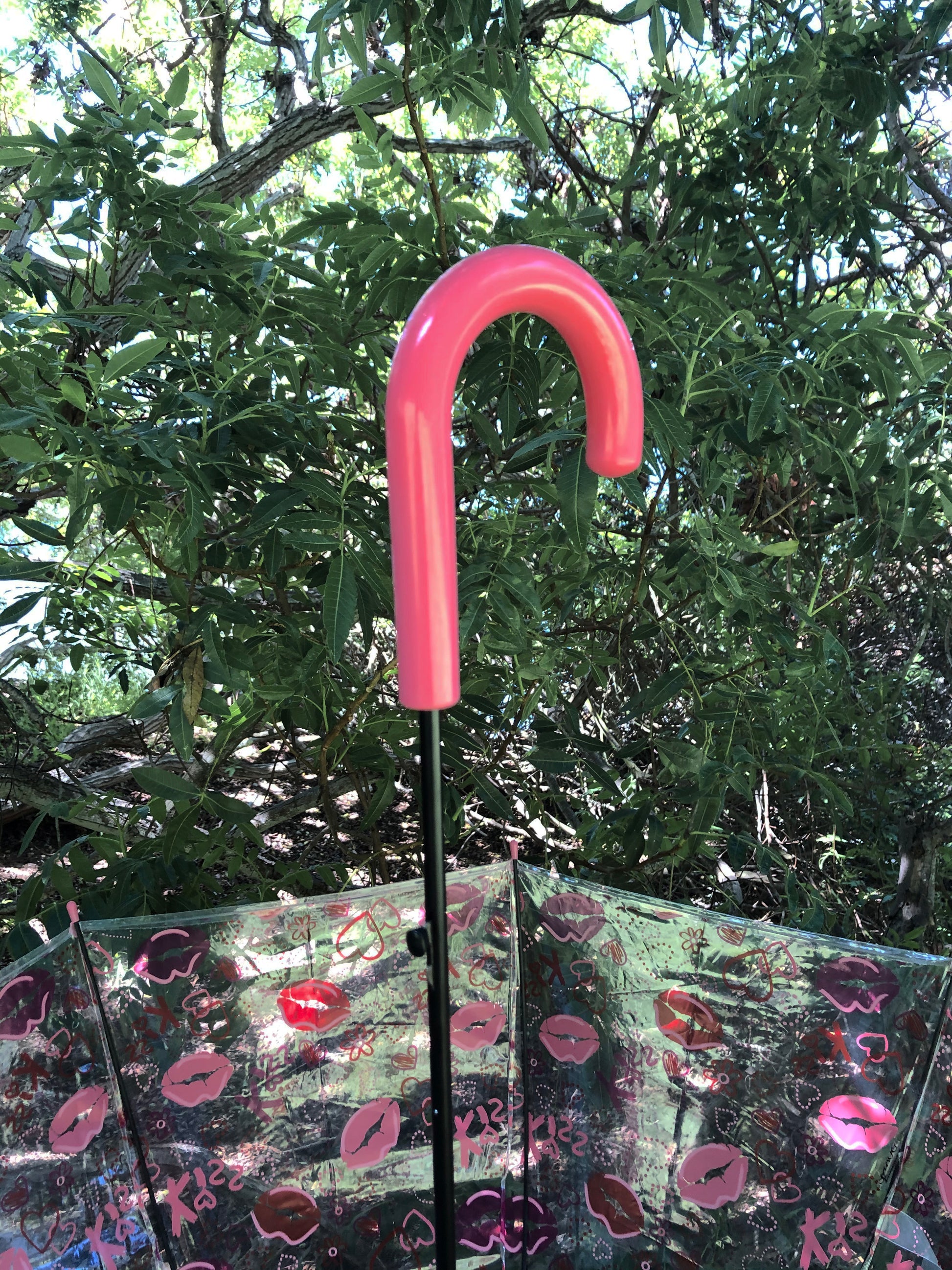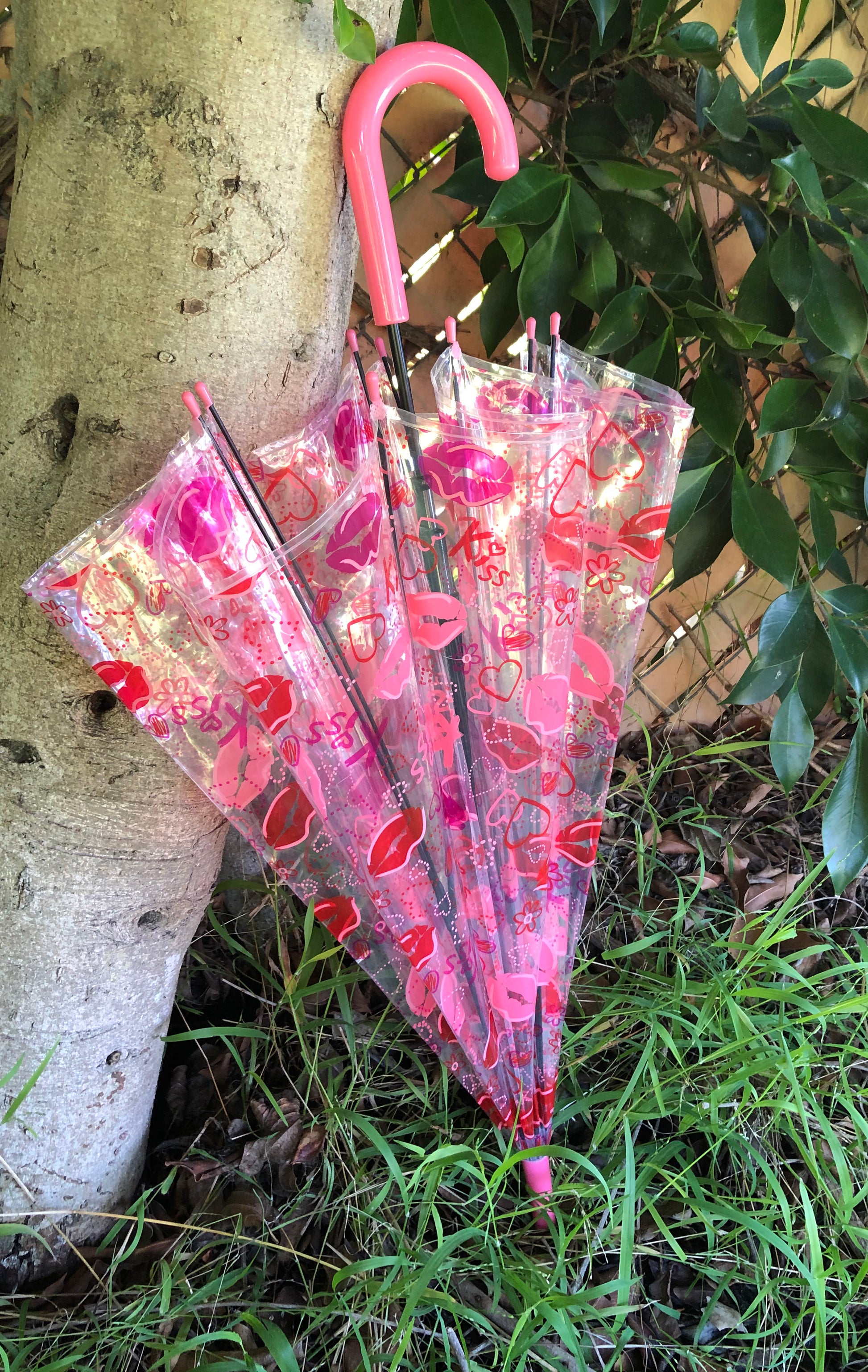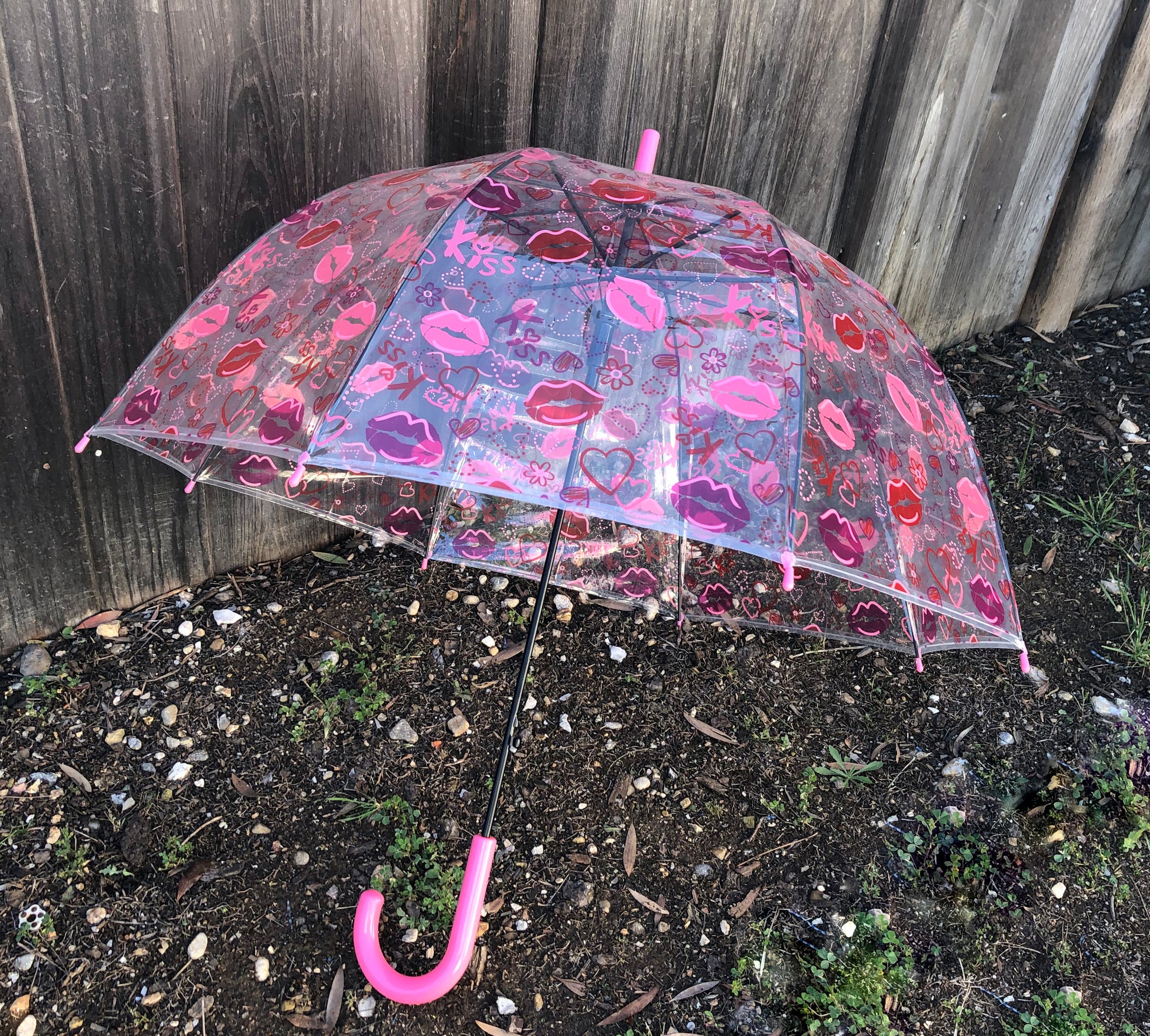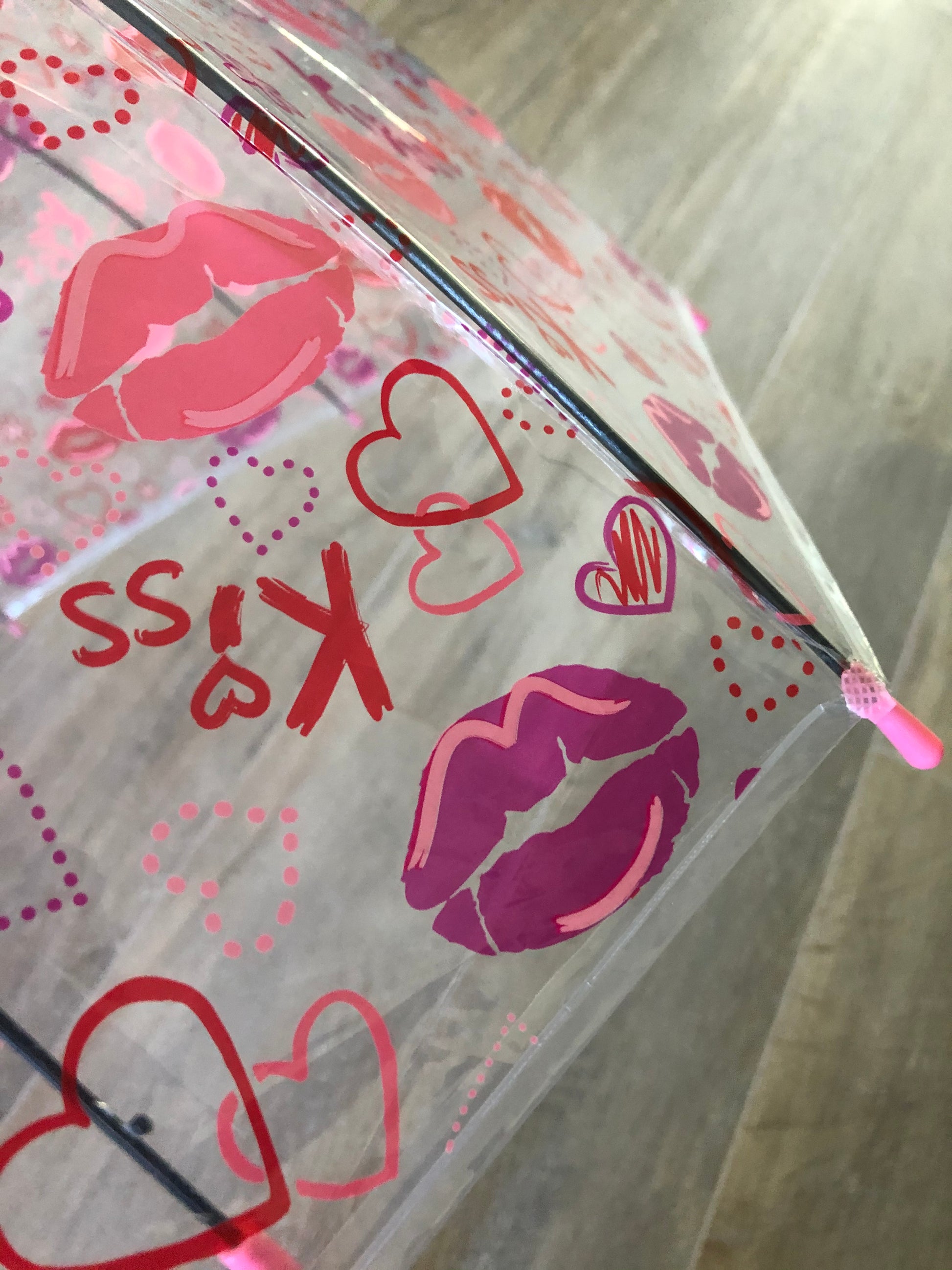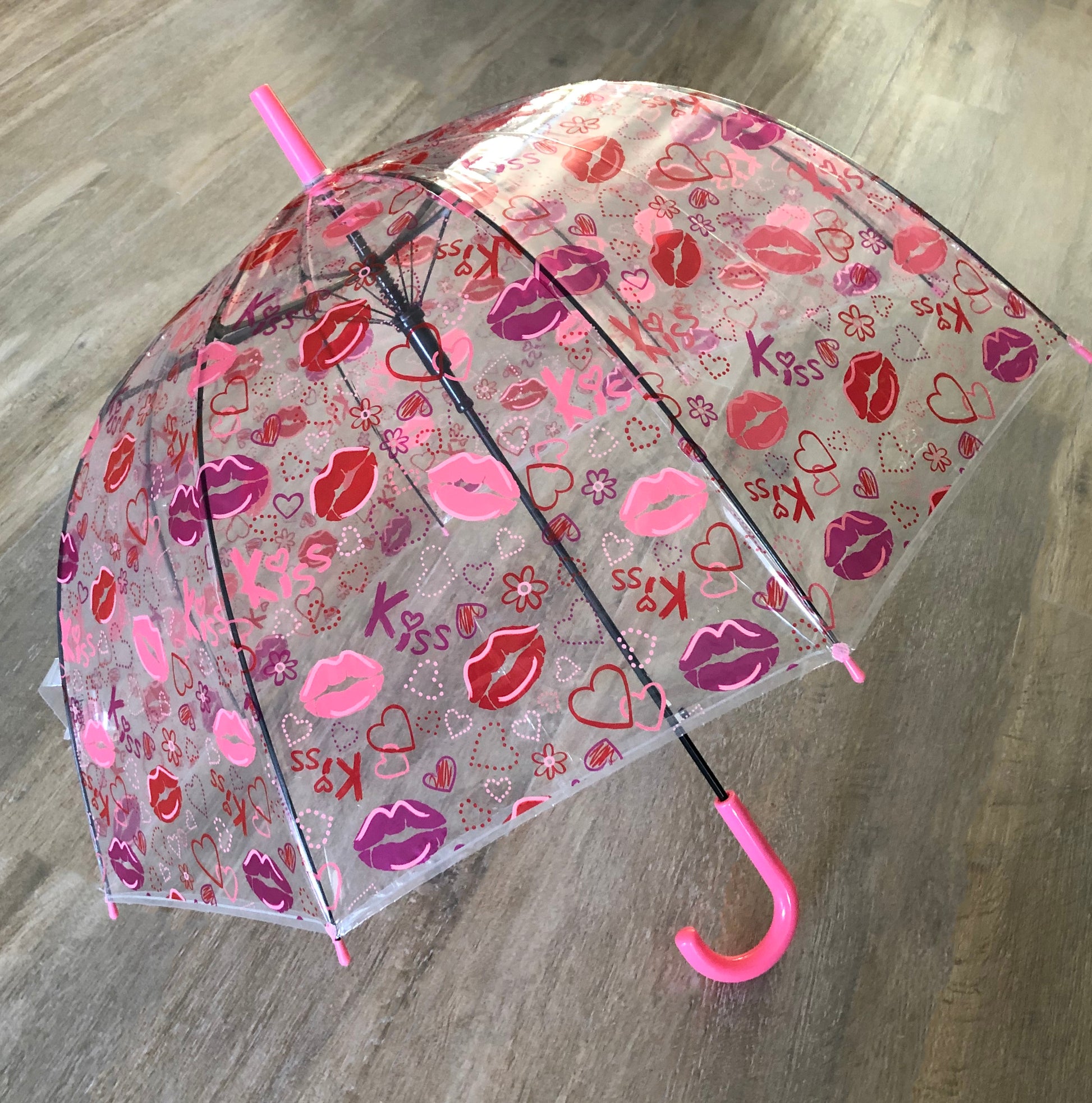 Navigate the rain with flair and ease. Crafted from lightweight materials, this umbrella ensures effortless portability without compromising durability. The canopy features a charming lips and kisses print that adds a touch of joy to rainy days. No sharp or pointy tips. A clear bubble umbrella is a must-have during the rainy season, turning every rainfall into a delightful fashion statement.
