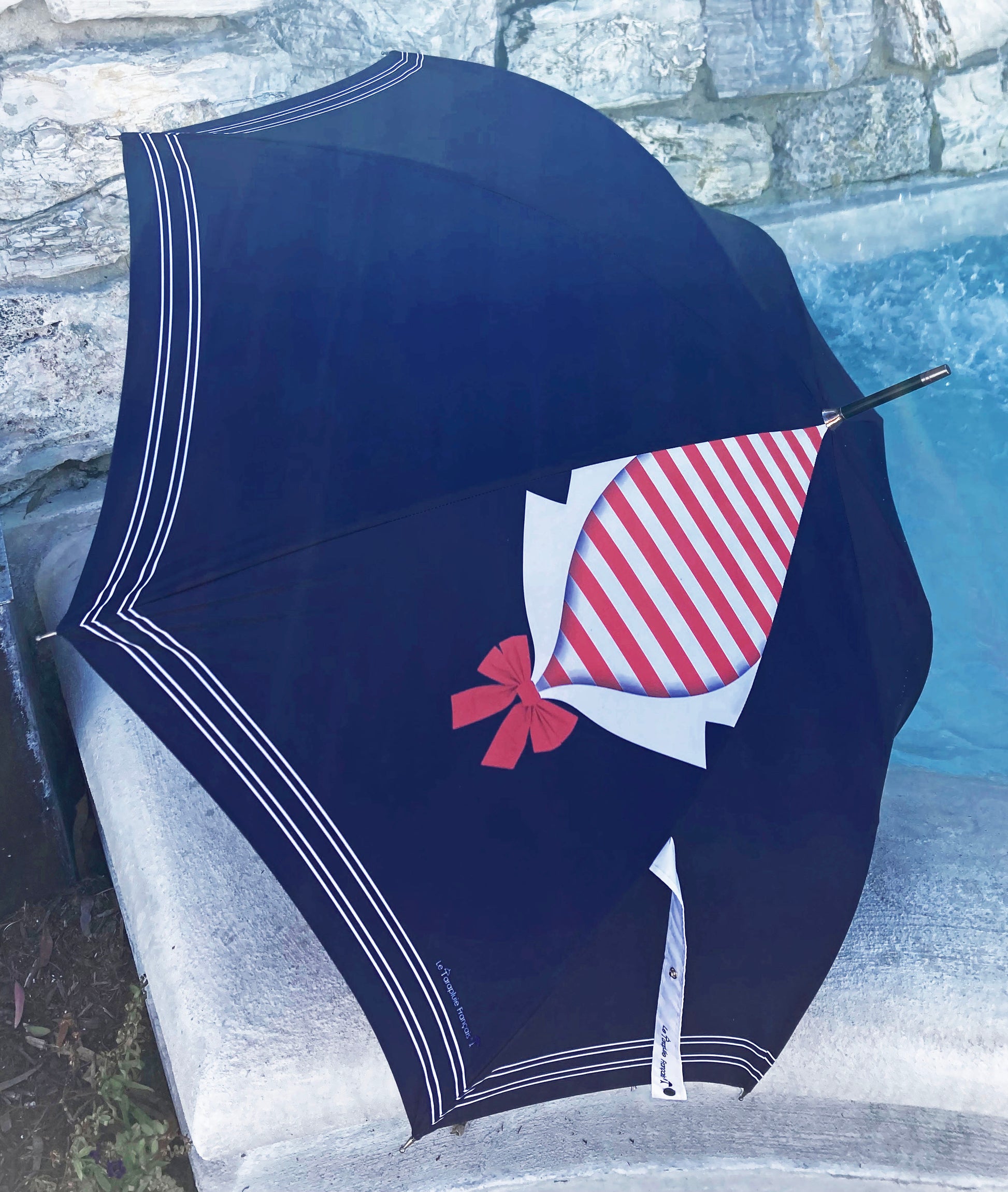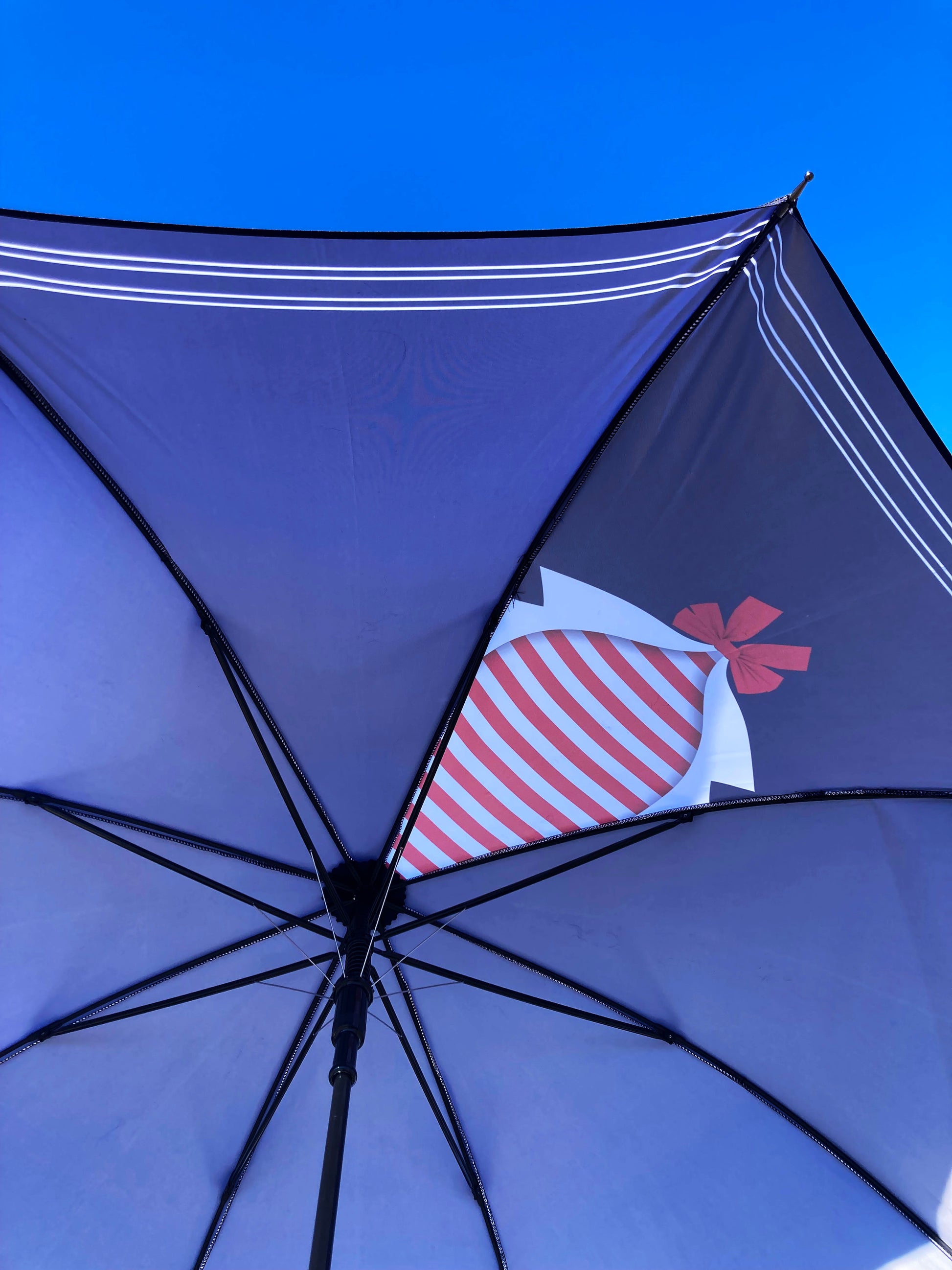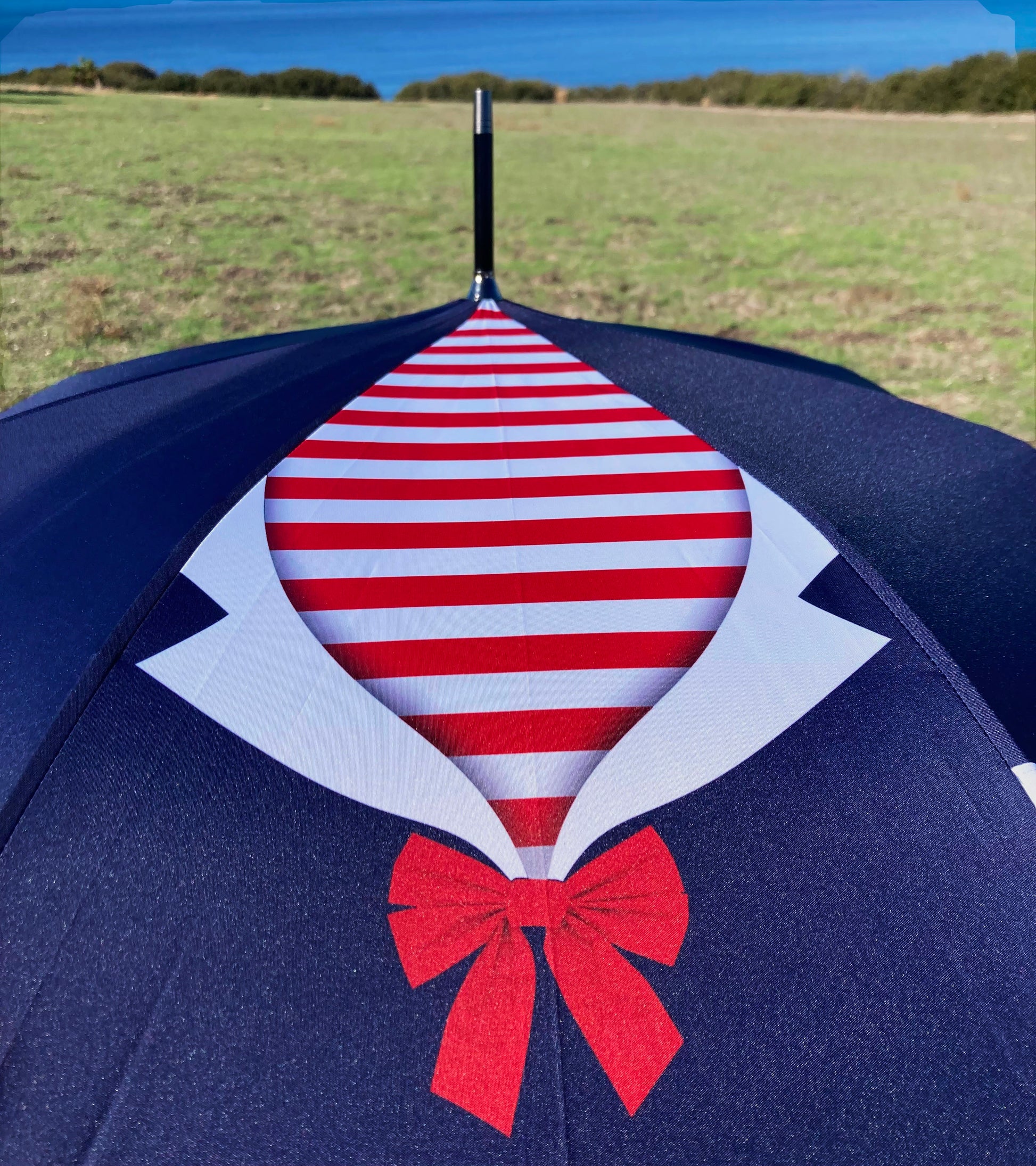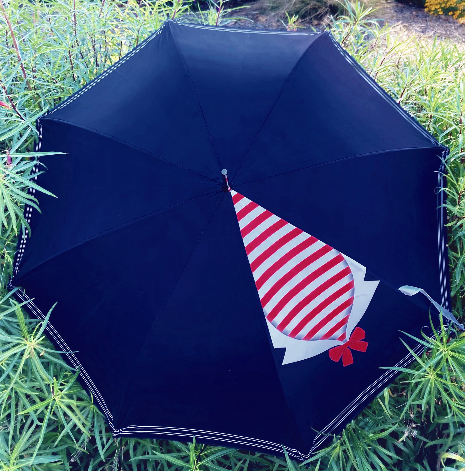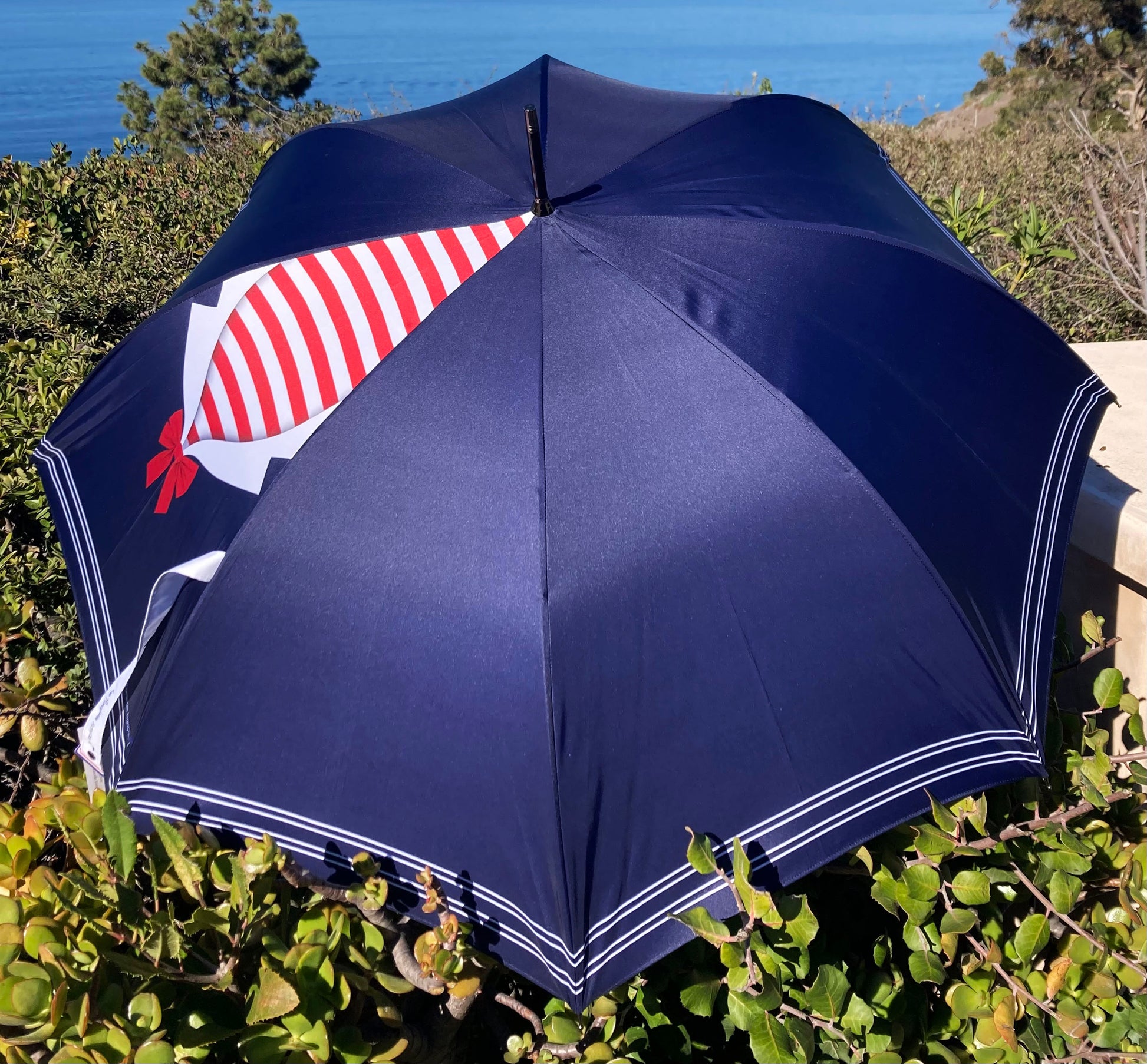 This umbrella showcases a classic sailor’s red-and-white-striped neckerchief, elegantly tied with a bow, set against a deep navy backdrop. Not only does it provide practical sun protection, but it also exudes nautical elegance.