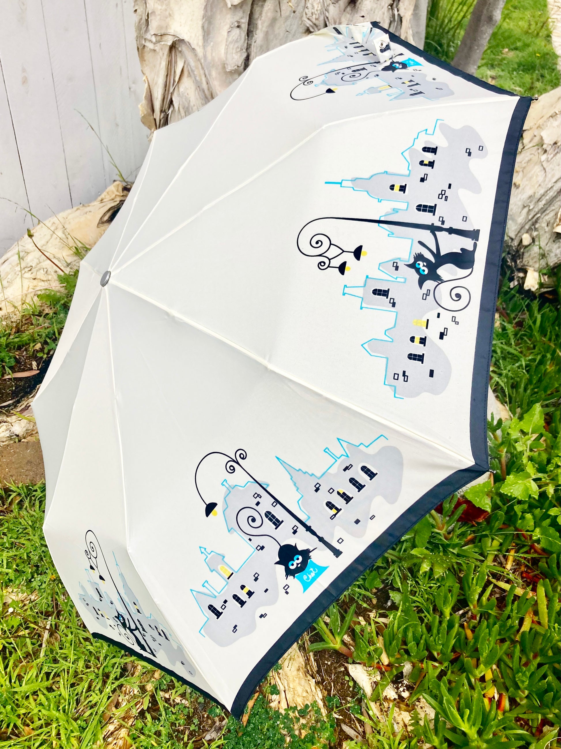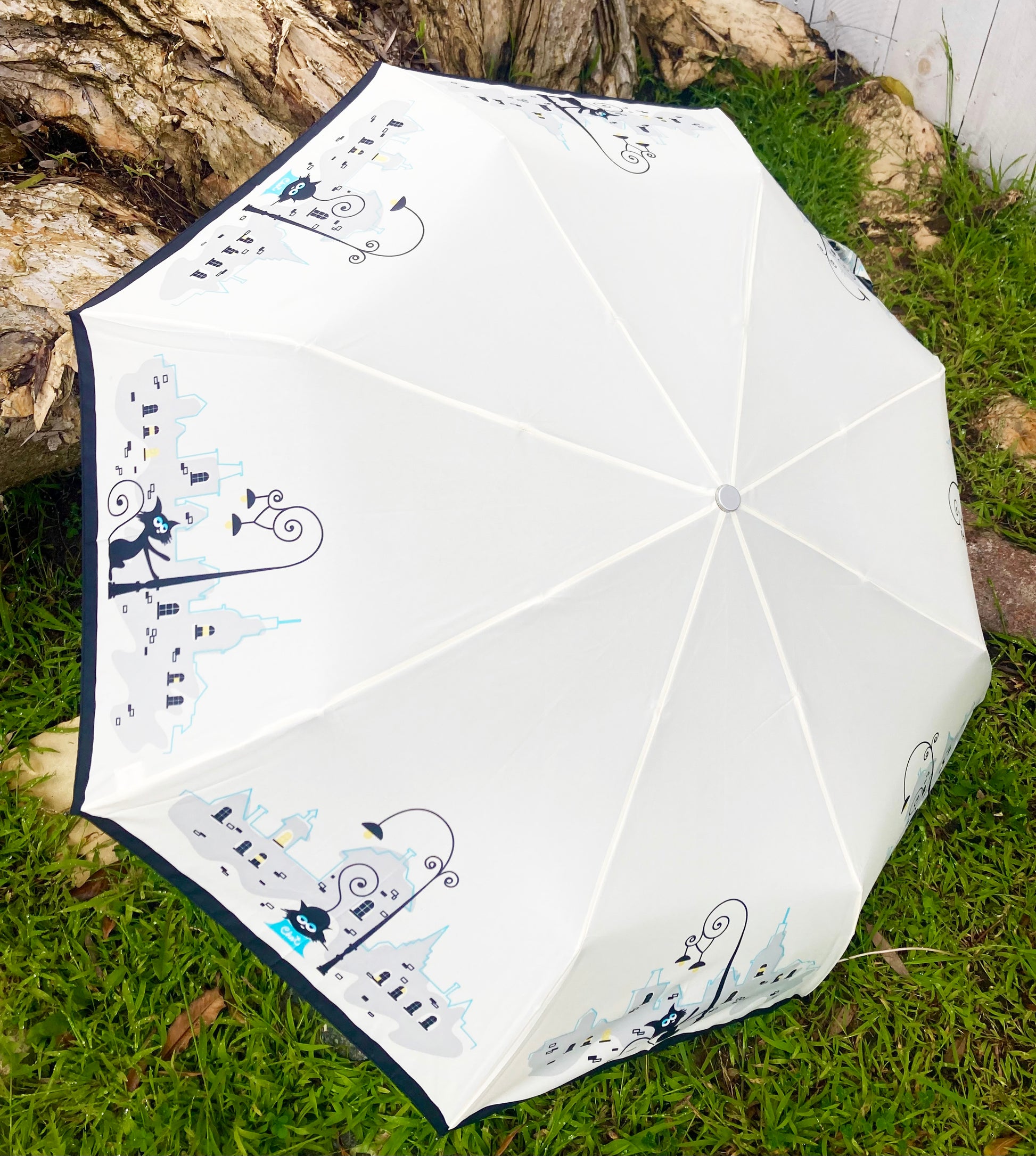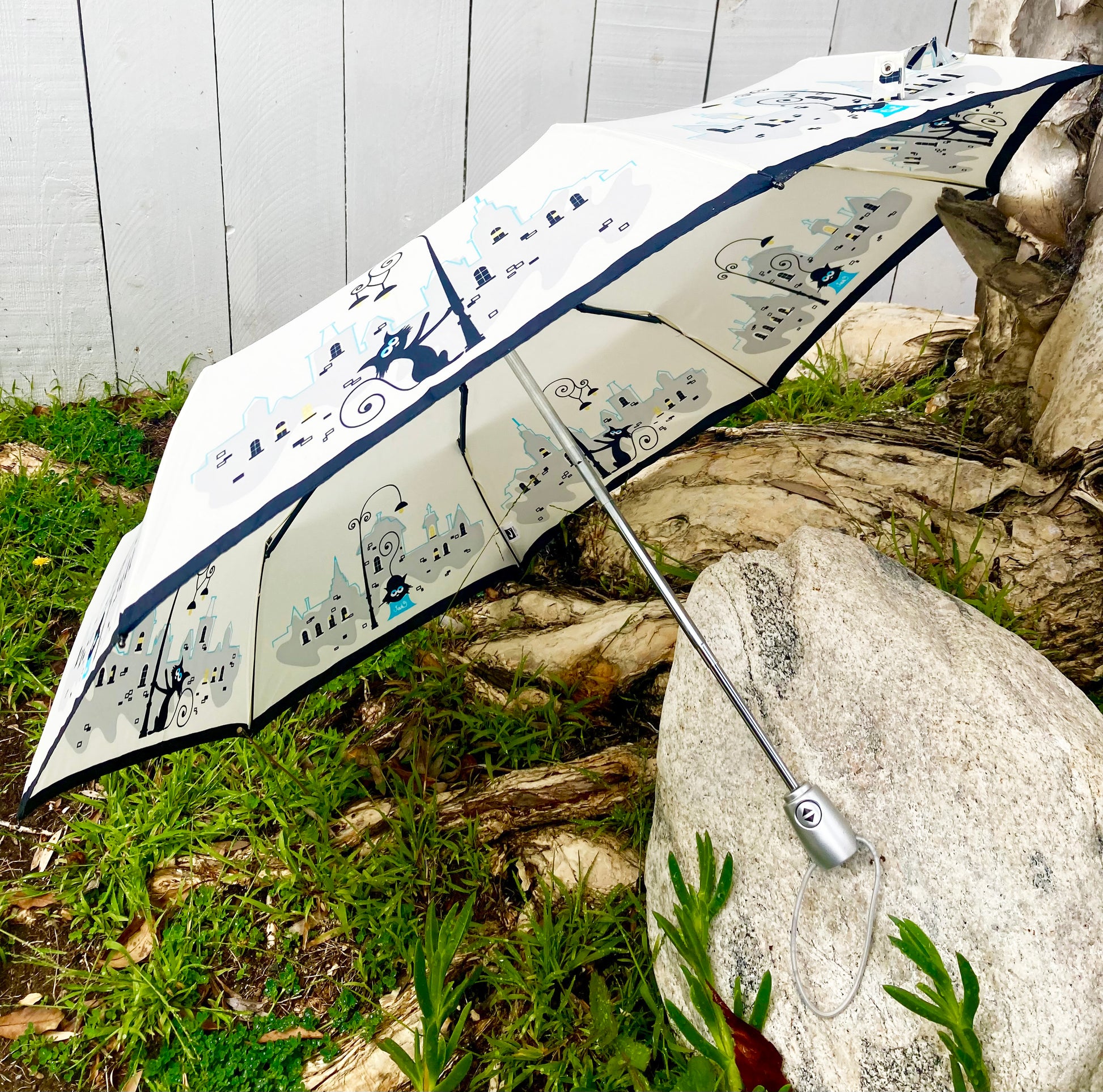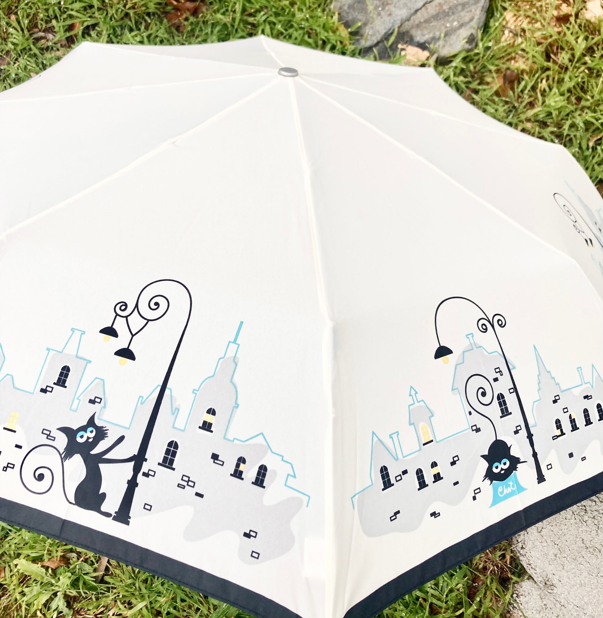 Parisian Cats Folding Umbrella | Sturdy Reinforced Ribs | Auto Open | 2-Step Closing System