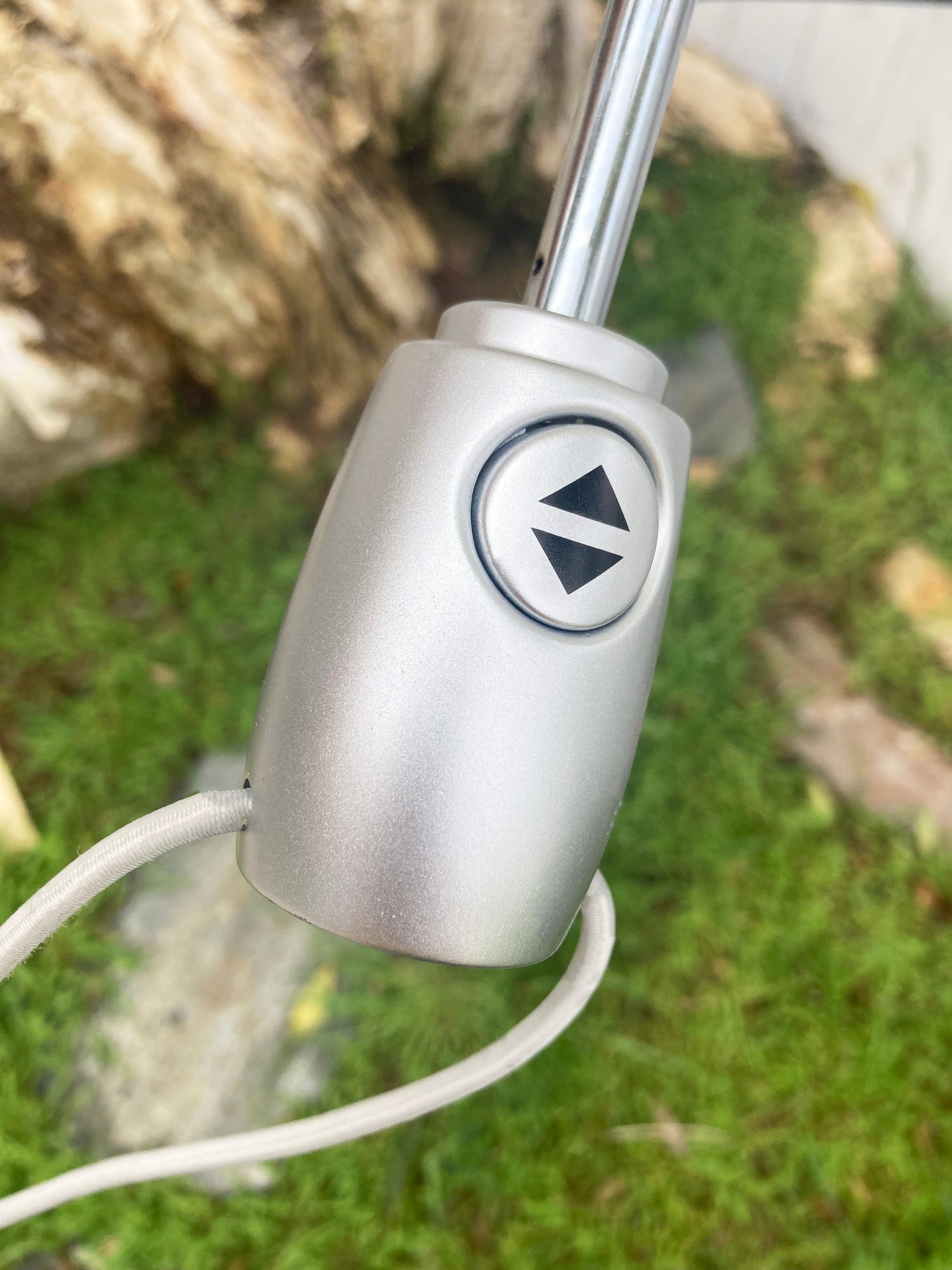 - To close: Press the button to release the canopy, then bring the slider down manually to retract the shaft.