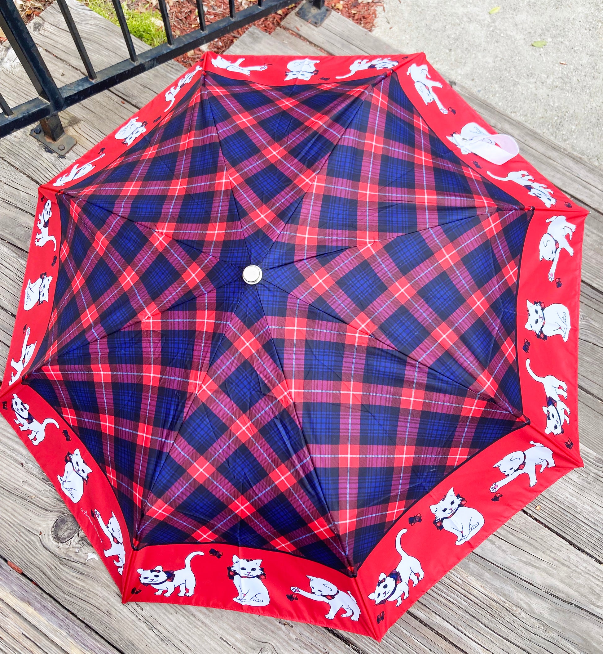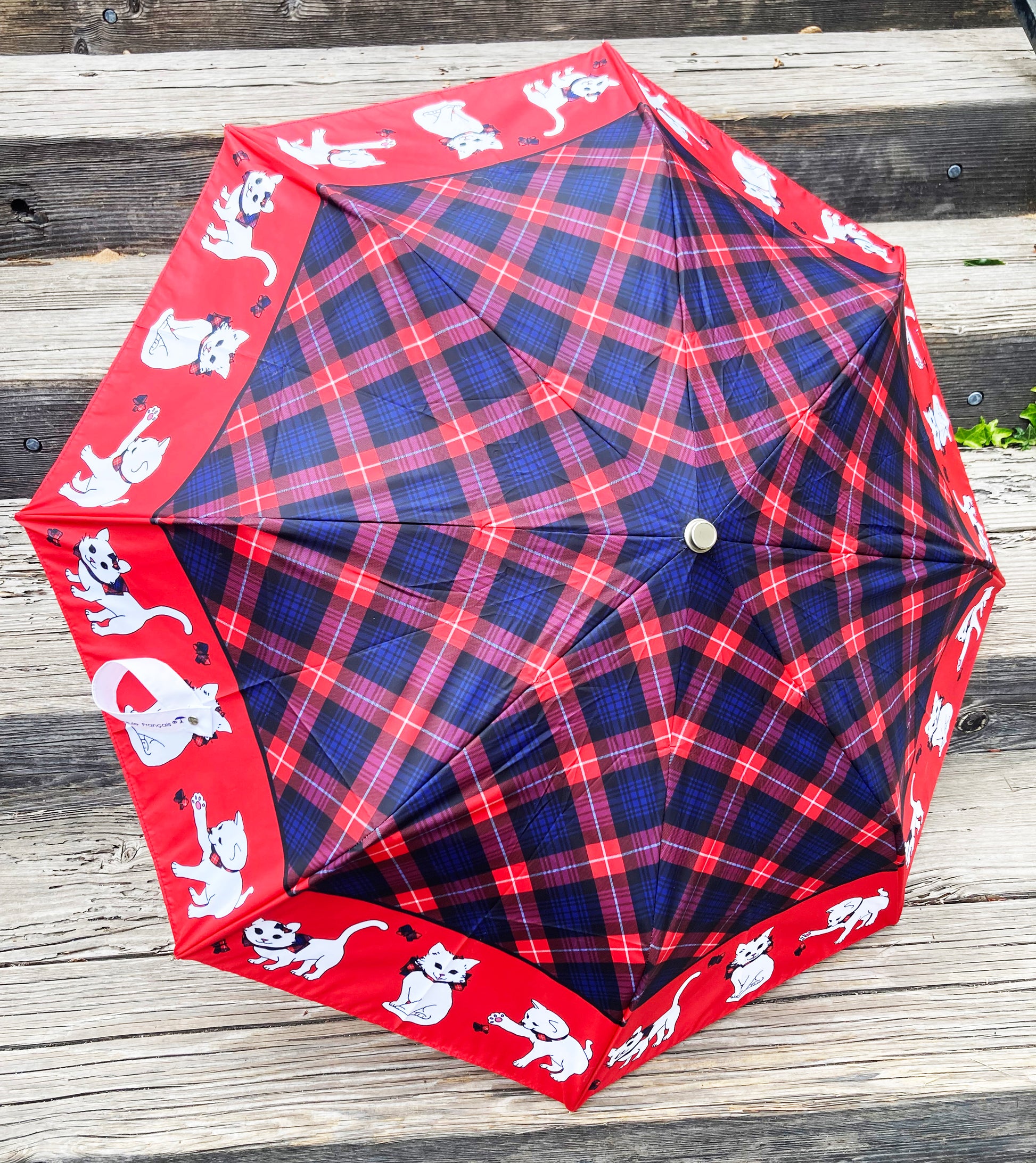 Featuring playful kittens set against a vibrant red and tartan plaid design, this umbrella offers anti-UV protection, reinforced ribs for durability, and an automatic open function.