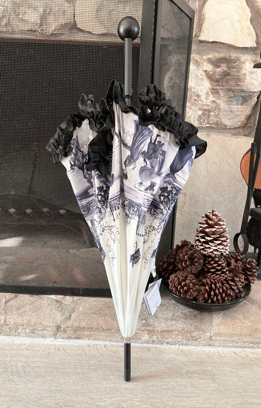 Cream Swirl Umbrella with Black Pipping | Petal-Like Shape | Waterproof