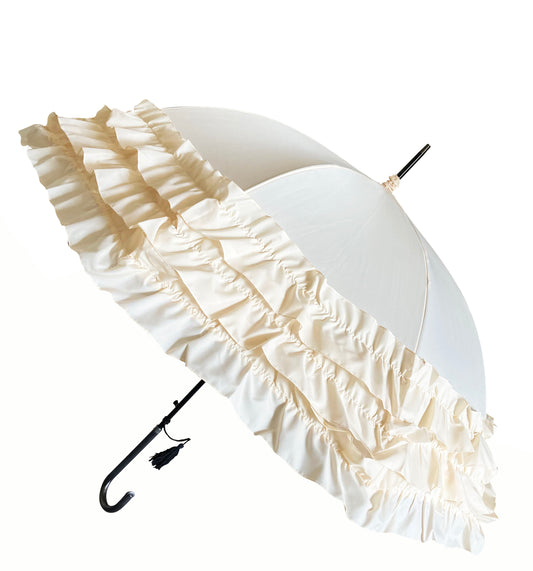 Large 3 Row Frill Cream Umbrella | Tassel and Leather Handle | Auto Open